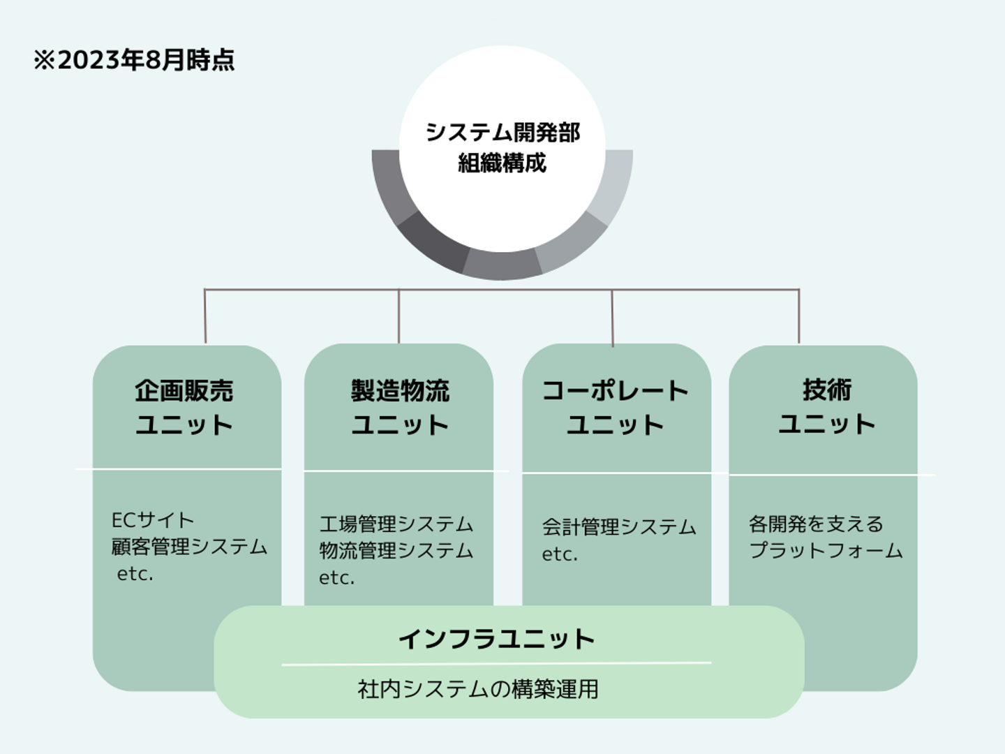 その他、コーポレートユニット・技術ユニット・インフラユニットと分かれて業務を細分化し、より効率の良い開発ができるように構成されております。
