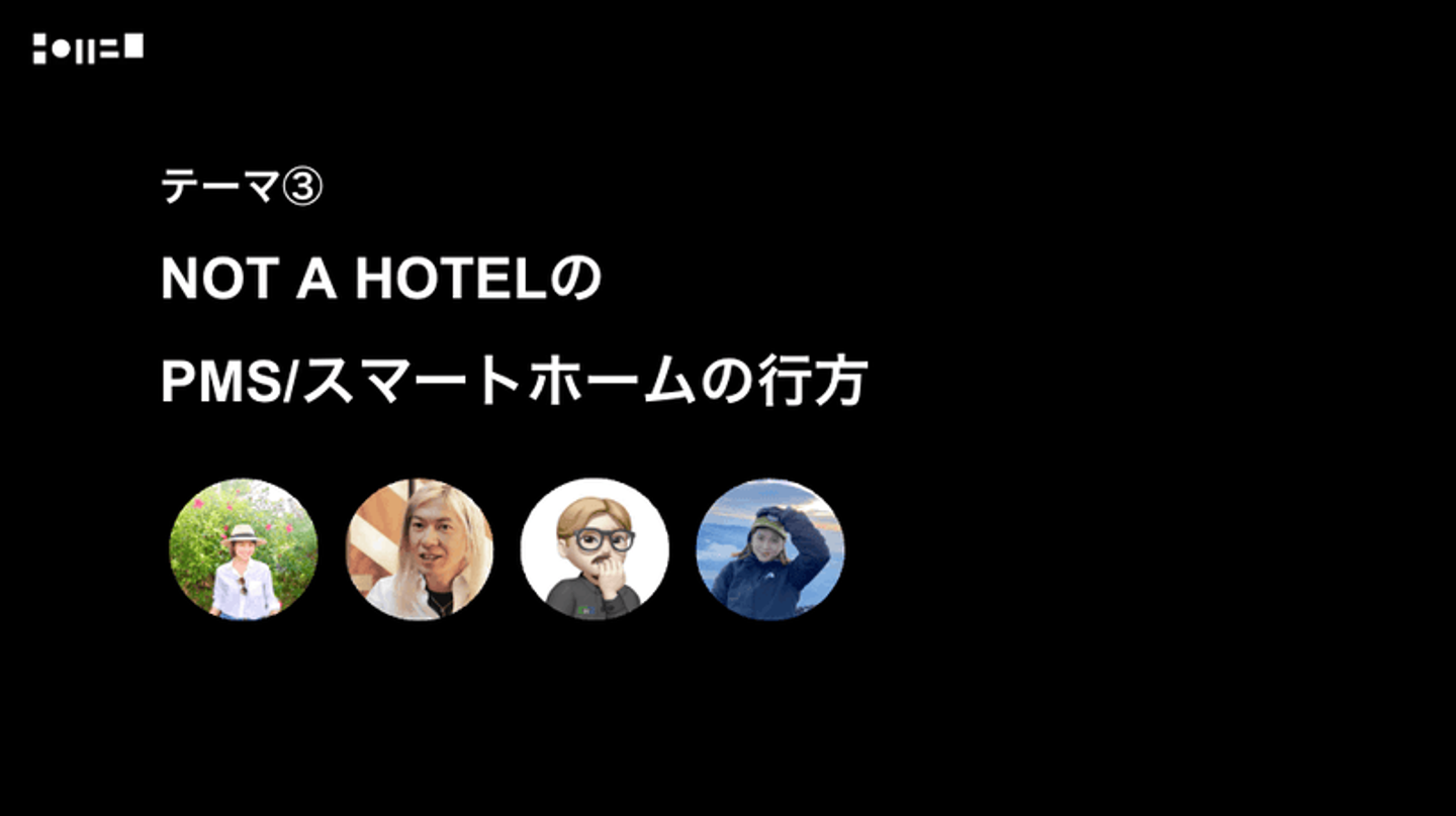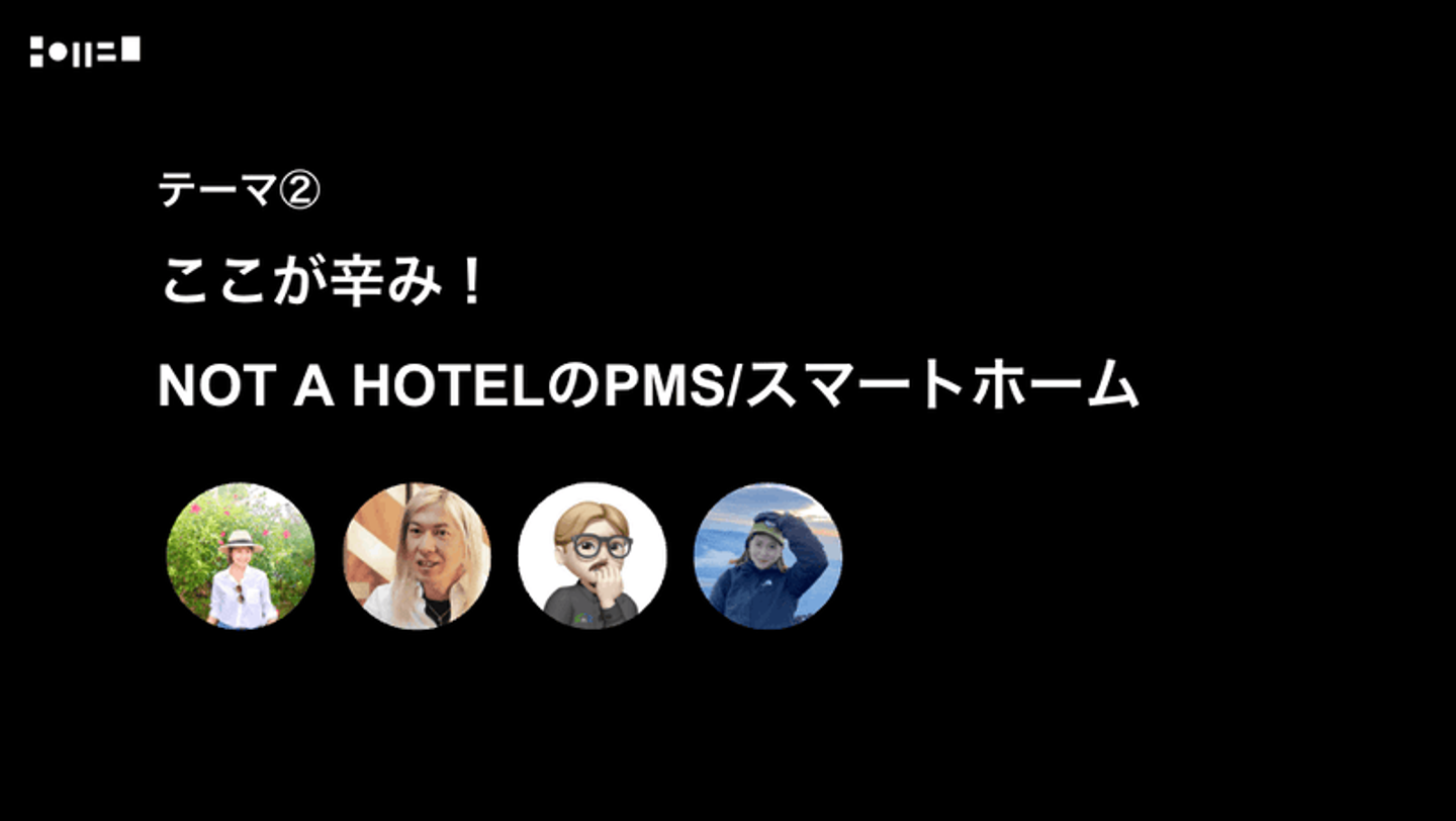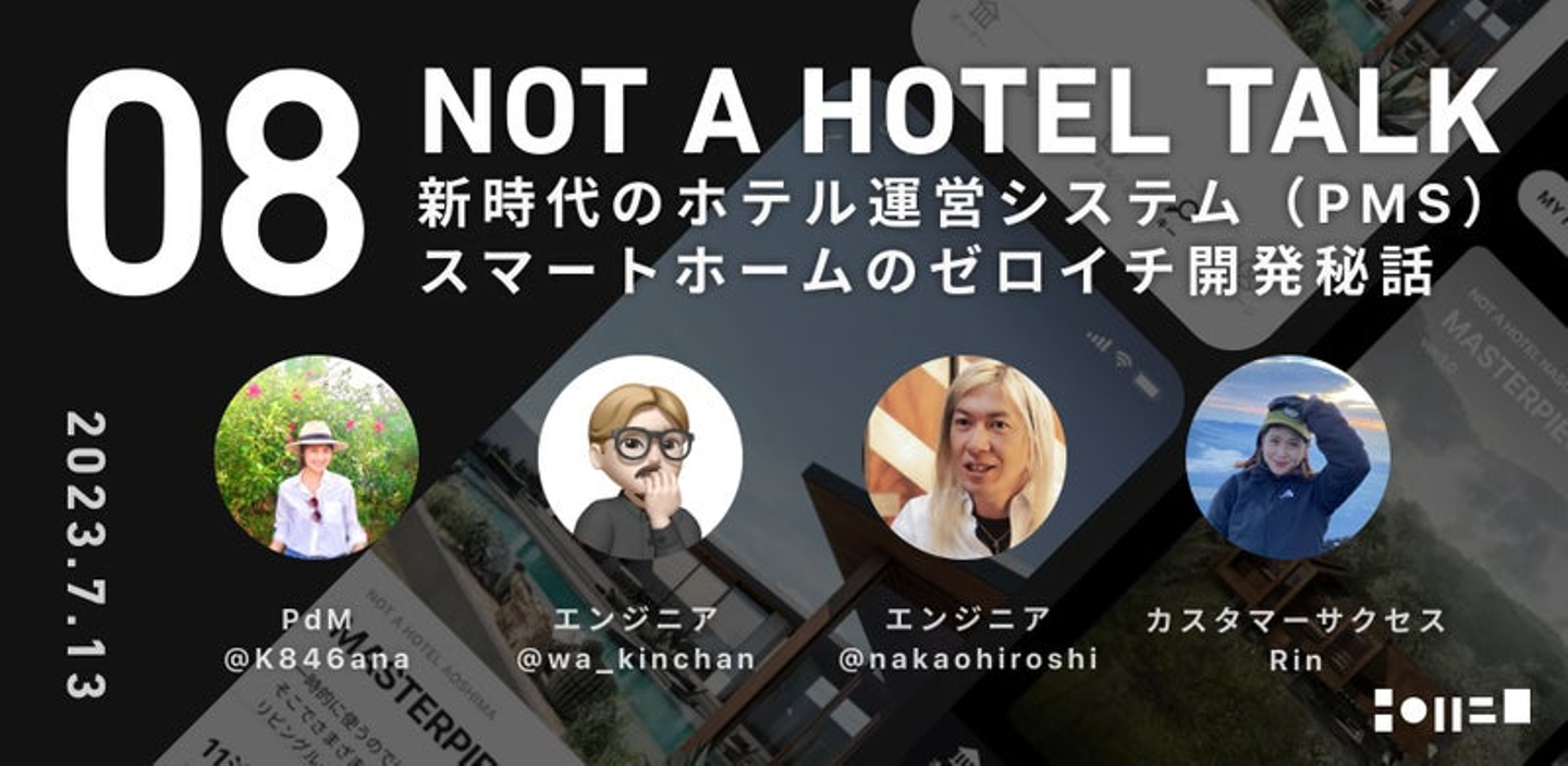 第8回目となる今回のテーマは「NOT A HOTELがゼロイチで開発したホテル運営システム・SmartHomeの舞台裏」。現在、NOT A HOTELでは「ホテル運営システム(PMS)」や「SmartHome」といったソフトウェアを、社内でゼロから開発しています。ソフトウェアエンジニアにPdM、そしてカスタマーサクセスなど、それぞれの観点からプロダクトの内製化や開発背景、今後の課題などを語ってもらいました。
