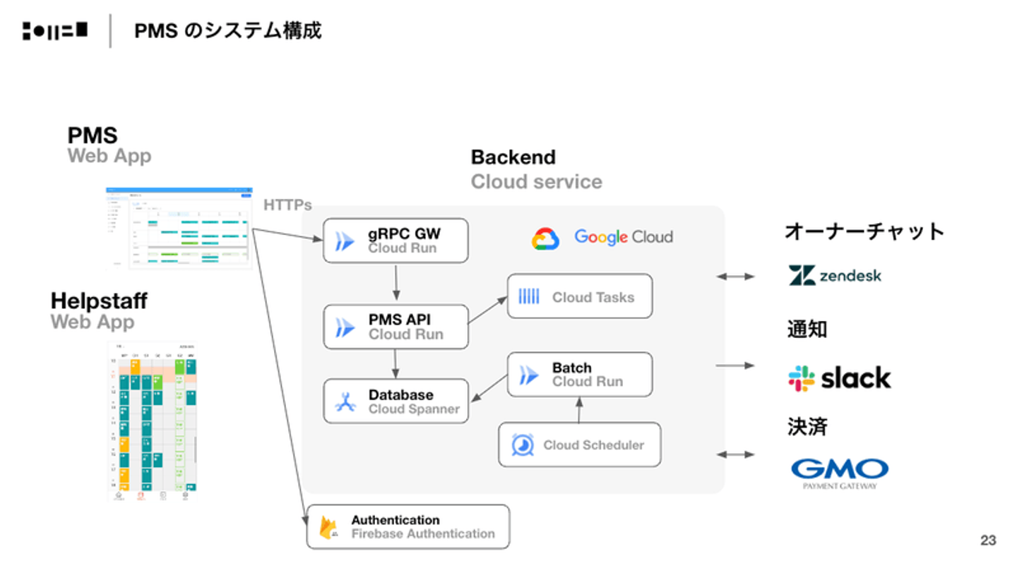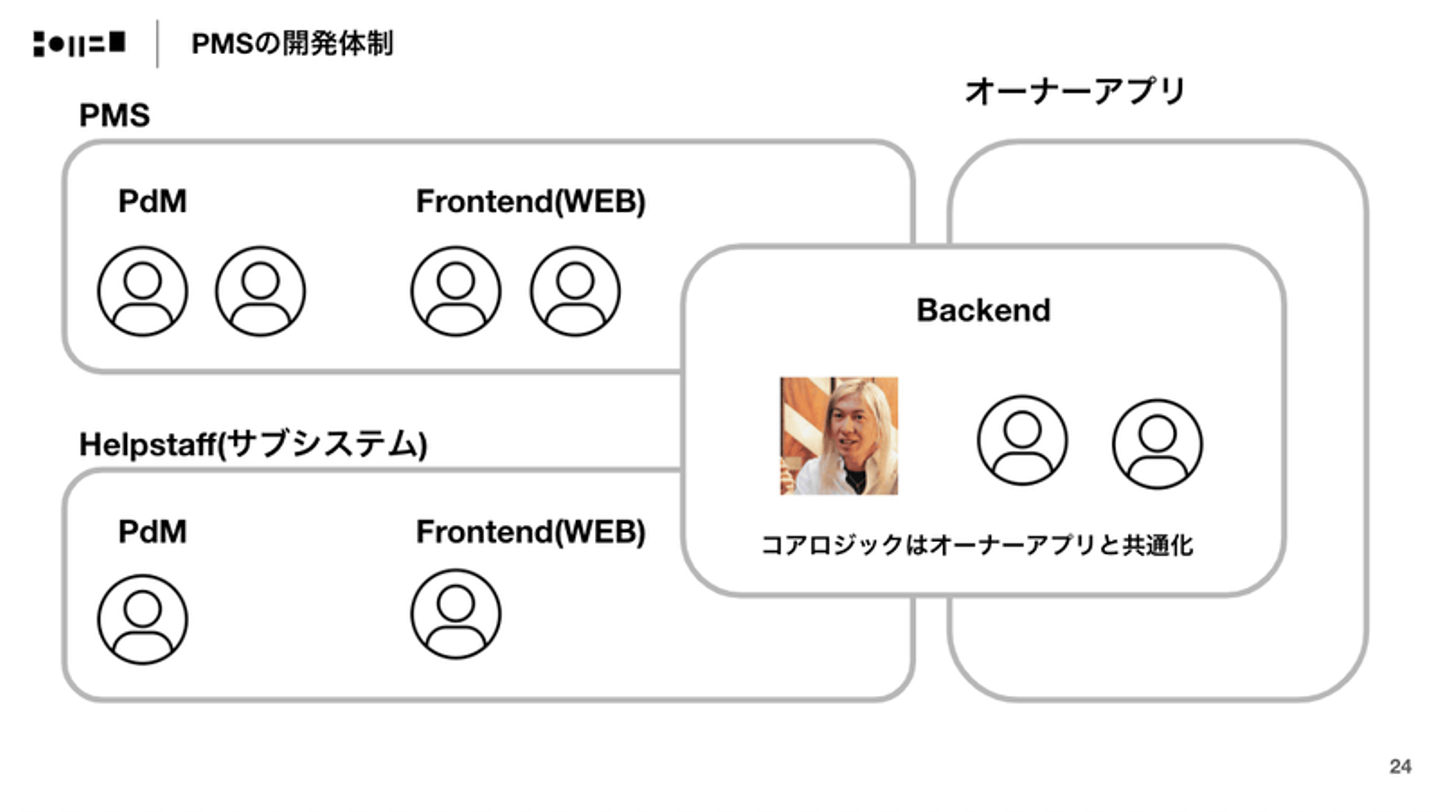 次に中尾は、Operation Toolのシステム構成と開発体制を紹介した。運営システムであるPMSも、現場スタッフが使用するサブアプリ「HelpStaff」も、どちらもWebアプリだ。開発は各アプリにPdMとフロントエンドエンジニアが付き、PMSに特化したバックエンドエンジニアは中尾が担当。ただし、一部のバックエンドは「Owner Main App」と共通化されている。