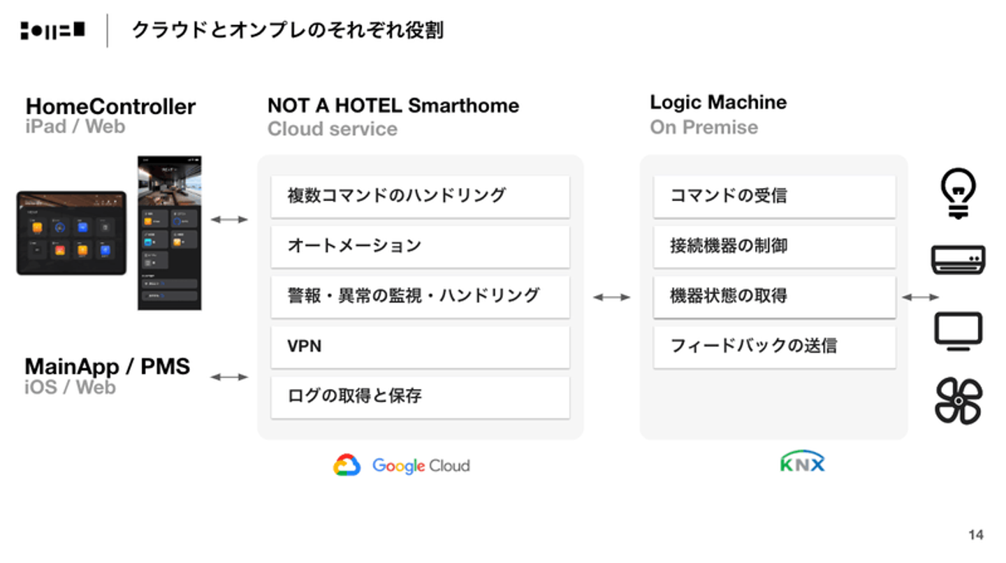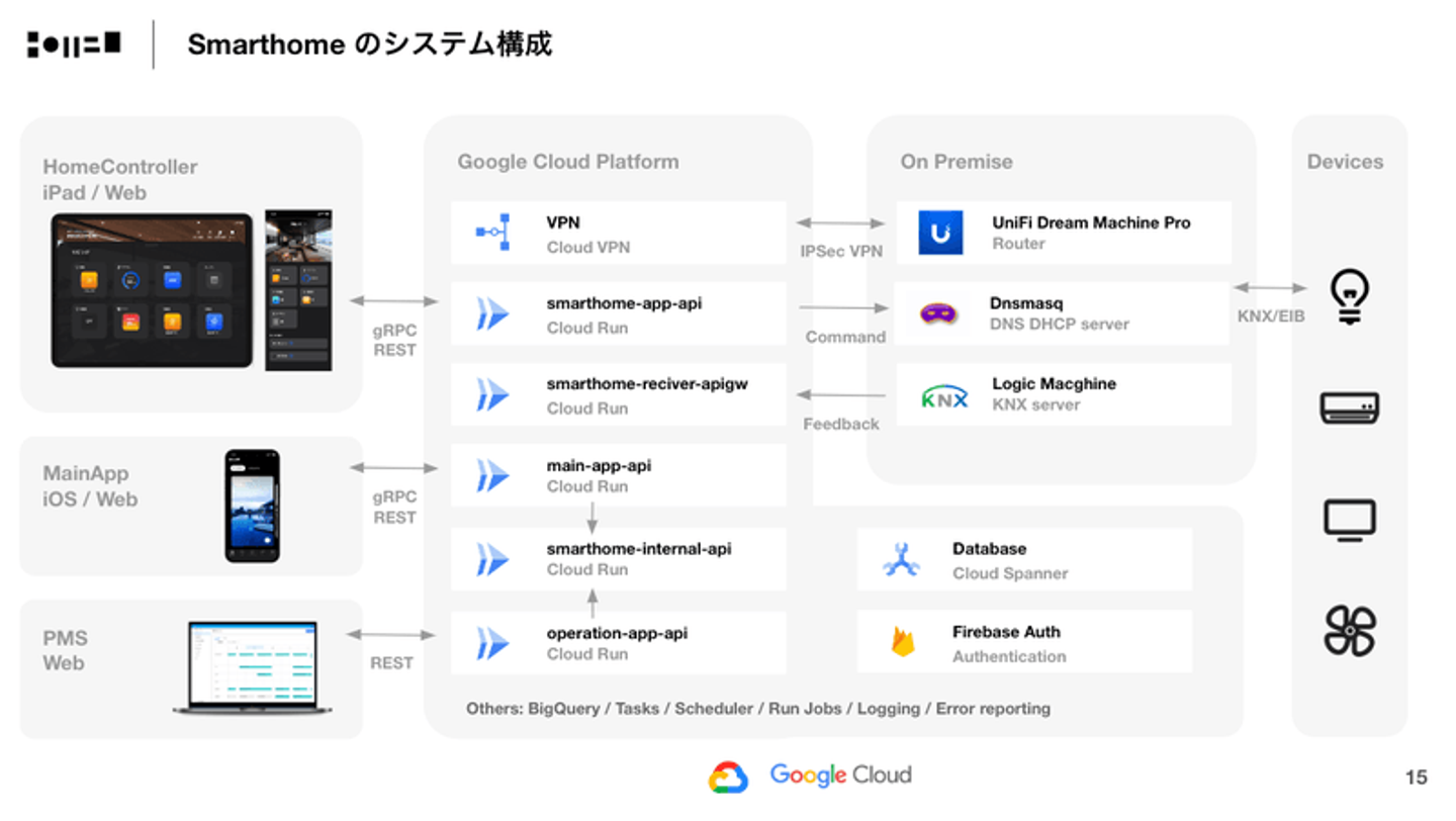 Google Cloud Platformを使ったシステム構成はOperation Toolに似ているが、SmartHomeを制御するプロトコルには欧州のKNX(国際規格で標準化されたオープンなホーム・ビルオートメーションのプロトコル)を採用している。設備と配線を物理的につなぐことで安定した制御を可能とし、世の中のさまざまな設備に接続できるのが特徴だ。iPadやWebのホームコントローラーからコマンドを送ると、KNXサーバーを介して設備が動作する。