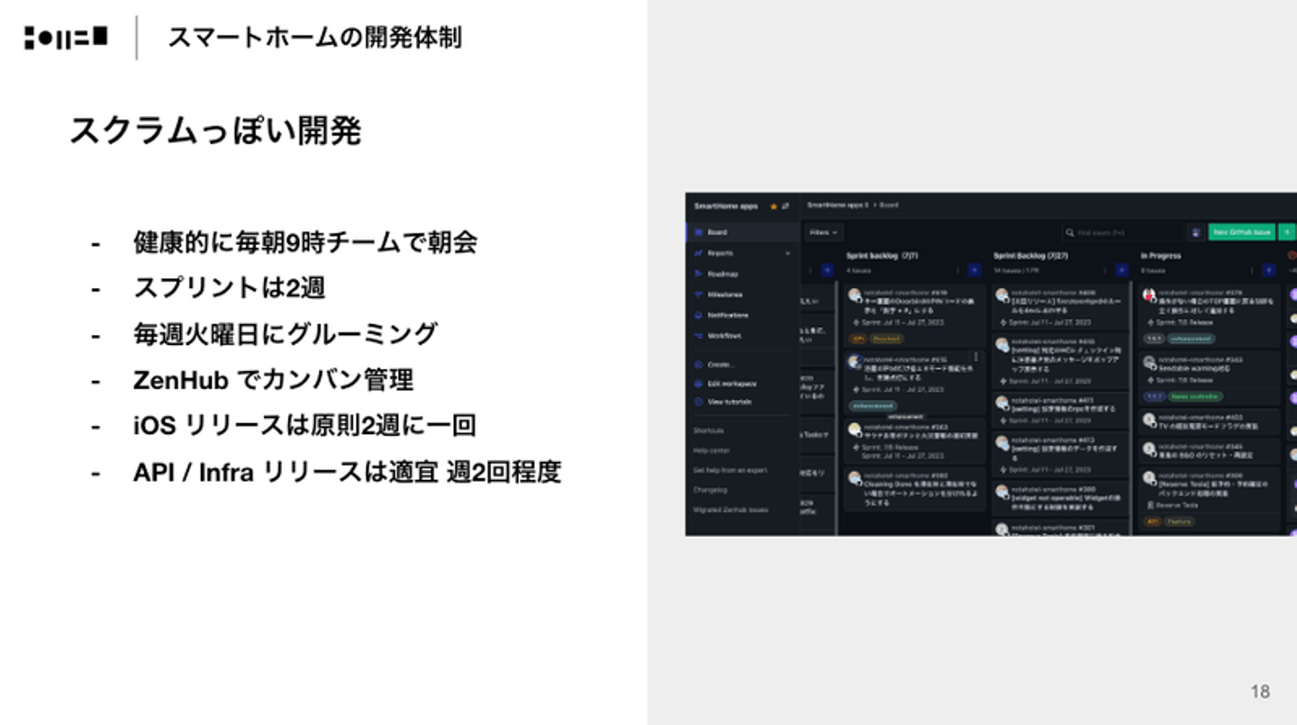 開発チームにはPO、PdM、iOSエンジニアのほか、Web/設備/Infraなどとざっくり役割を分けてバックエンドエンジニアを配置。短期間で計画と実装を繰り返すスプリントや、バックログを適宜整えるグルーミングなど、スクラムの開発手法を取り入れながら進めている。