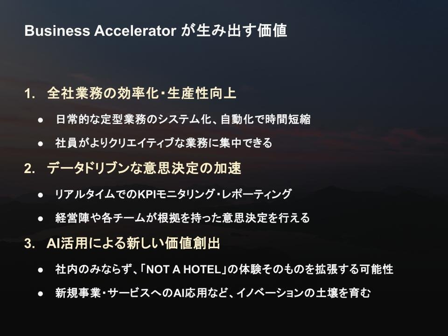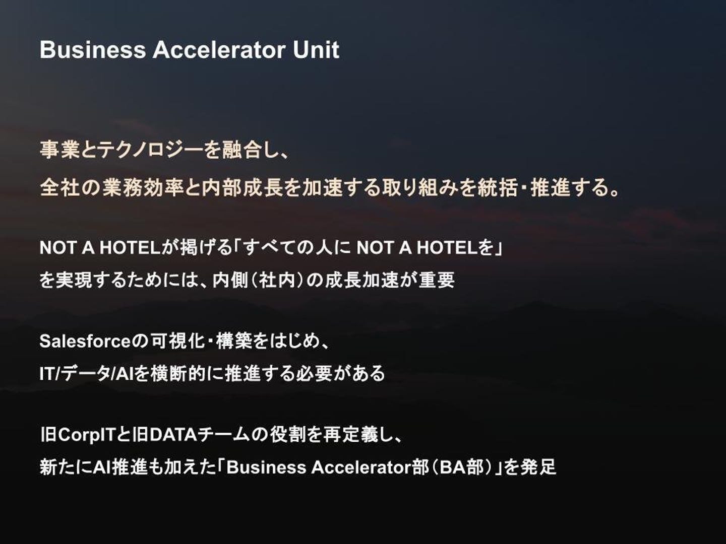 Salesforceを中心とした業務基盤の整備、SaaSの選定と運用、データの可視化、AIの導入など、全社横断のテーマを一気通貫で担い、「すべての人にNOT A HOTELを」届けるための社内成長エンジンとして機能していきます。