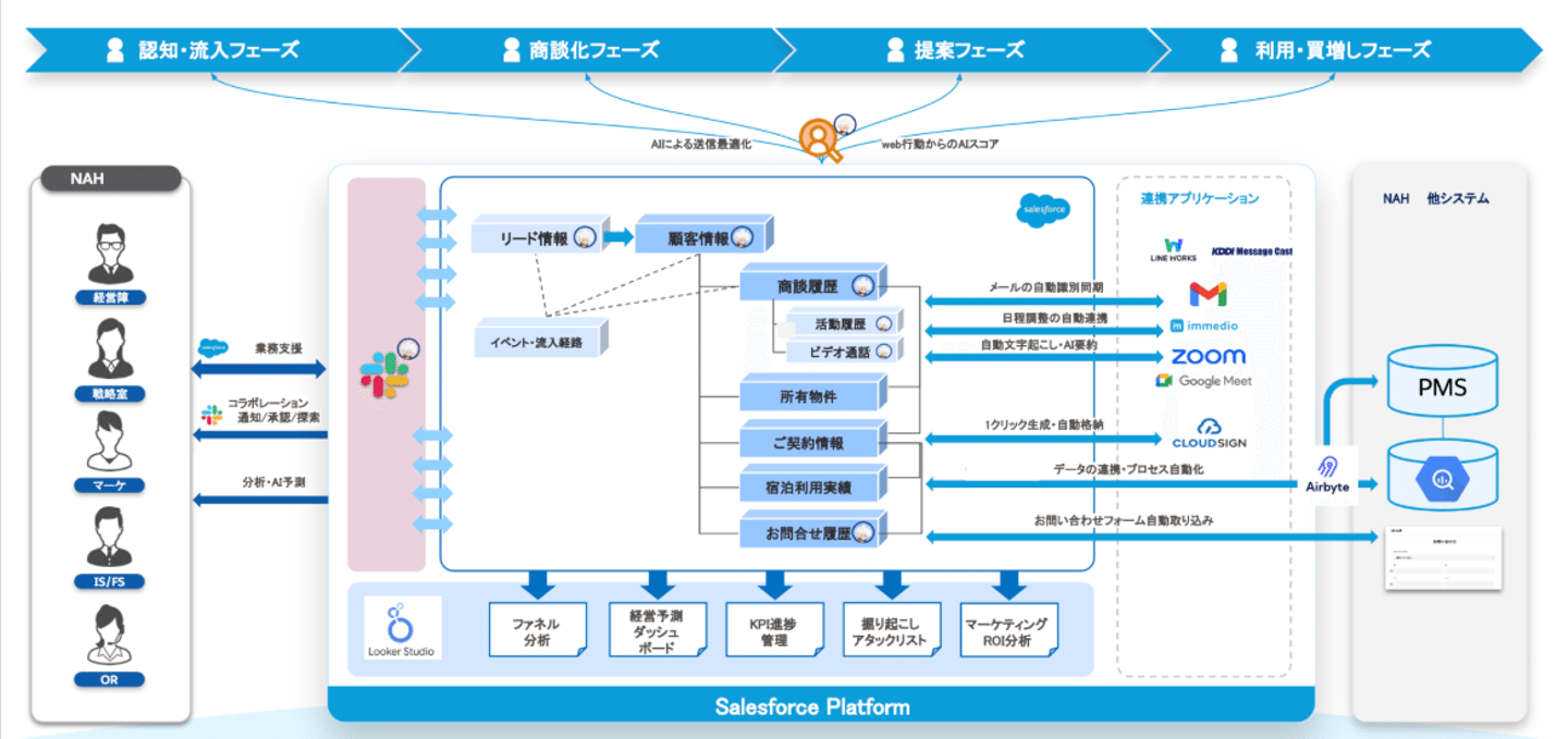 Salesforceに関しては主にセールス・マーケティング部門で活用が進んでいます。SFA(営業支援システム)としての商談管理だけでなく、契約したオーナーさんのホテル利用状況などの情報も連携させ、営業担当者がリアルタイムで状況を把握できるようにしています。