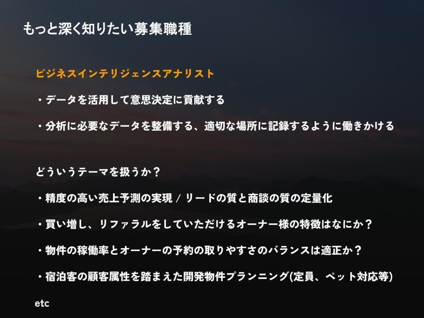 たとえば、契約者と向き合うオーナーリレーションのチームでは「満足して追加購入されるオーナーさんの特徴は何か」といった分析や、ホテル運営チームでは「物件の稼働率とオーナーさんの予約取得のバランスをどう最適化するか」といったテーマも扱っています。