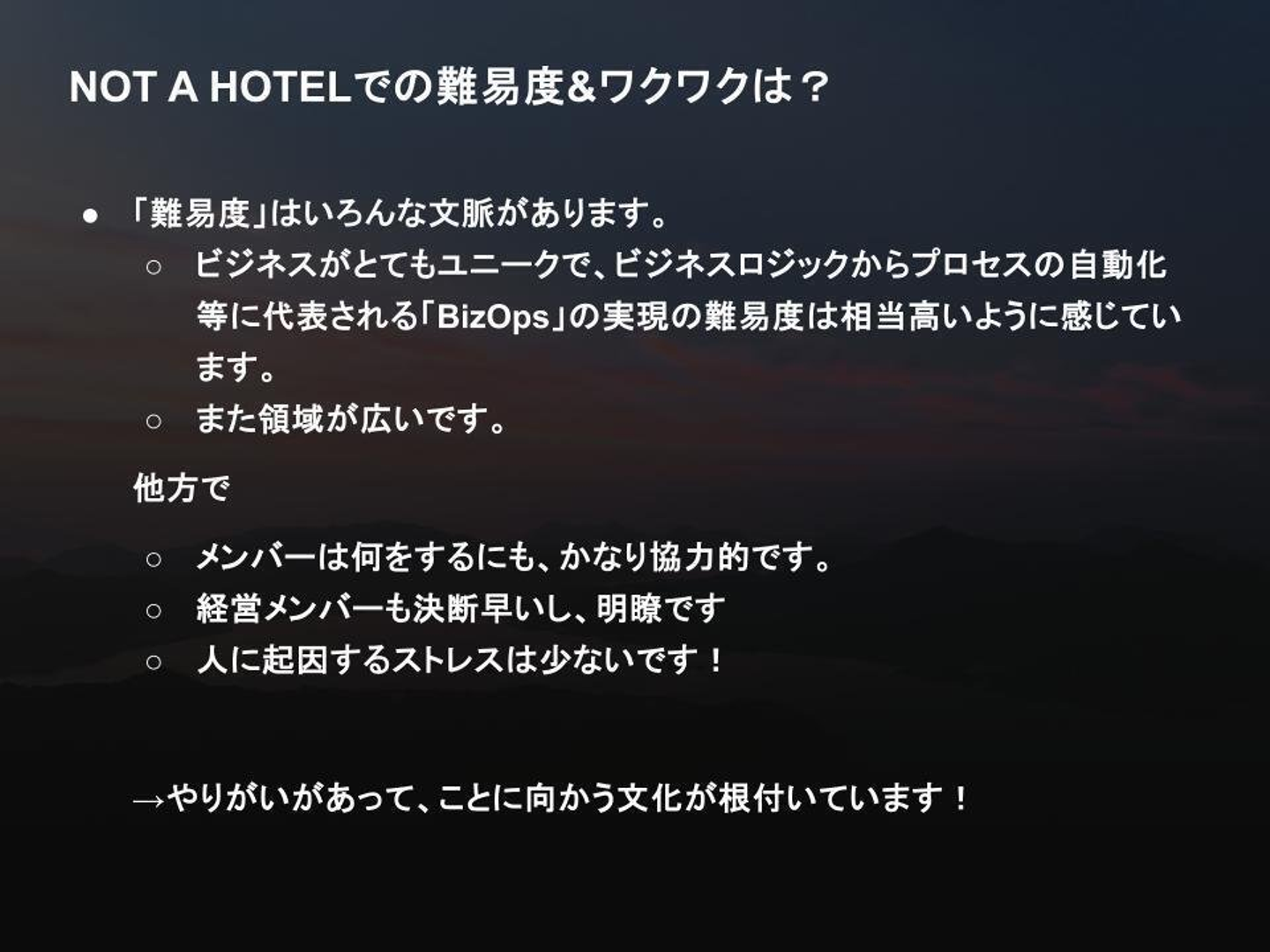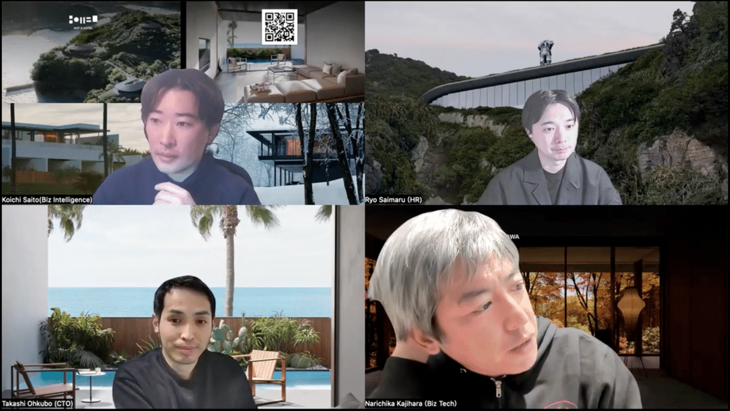NOT A HOTELはフラットな組織で、役割の垣根を超えて協力し合うことが多い。セールスがソフトウェアの設計に関わったり、ソフトウェアエンジニアがビジネスロジックを考えたり、シェフが建築について意見したり。「自分はエンジニアだから営業のことはわかりません」と線引きすると、この組織は成り立ちません。垣根を超えていける人が望ましいです。