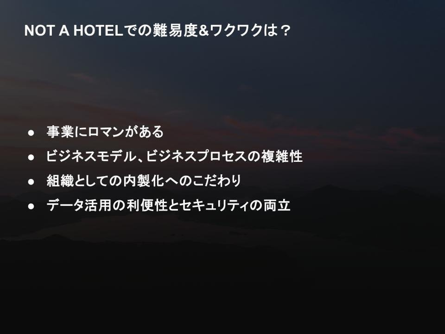BAチームの活動には、NOT A HOTELならではの難しさと魅力がある。登壇者たちはその特徴を「広さ」「深さ」「速度」の3点から説明した。多様な事業領域と変化の速さは高い難易度を生み出すが、同時にそれがワクワク感の源泉にもなっている。