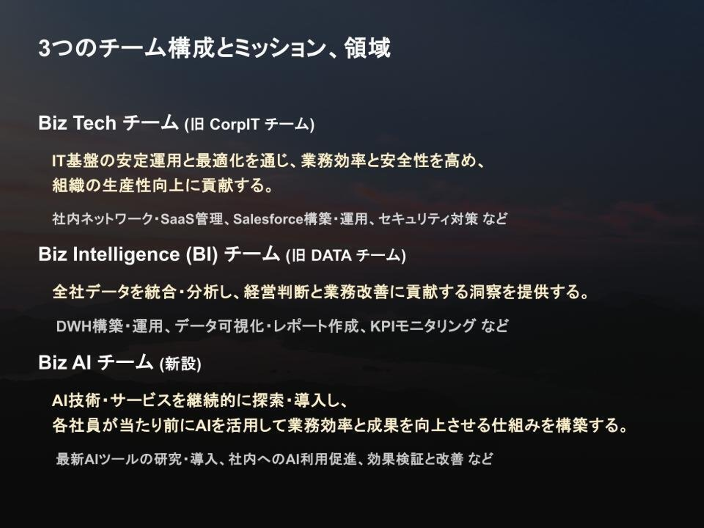 まずは「業務のシステム化とIT基盤の安定運用」を担うBiz Techチーム。社内ネットワーク、SaaS、セキュリティ、Salesforceなど、社内のITインフラを支えるチーム。業務のシステム化とIT基盤の安定運用を担当します。
