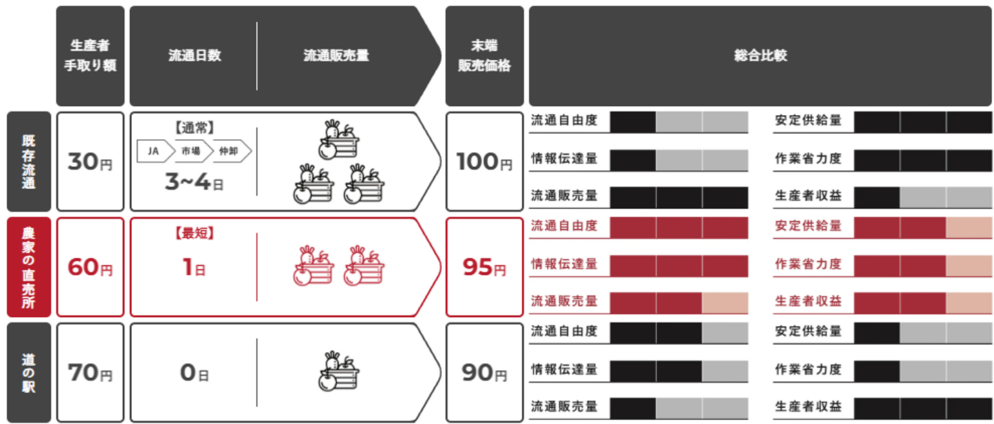 既存流通と比較し、生産者にとっては収益性の高い販路を獲得、生活者にとってはコストメリットの高い商品を購入できる