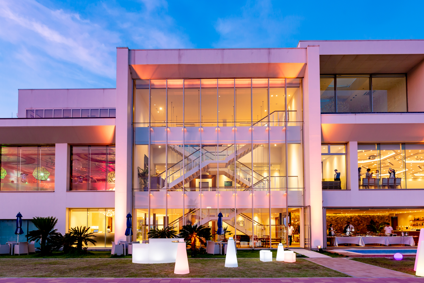 今回、天井高最大5.3m、面積約210m²の披露宴会場を“万華鏡アートミュージアム”として貸し切りました。約1000本のキャンドルは館内のチャペルや敷地内の芝生スペースなどで灯します。