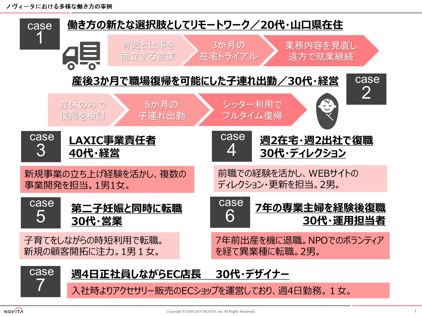 ノヴィータで2015年から運営しているWEBメディア「LAXIC(ラシク)」などを通じ、「ライフイベント(結婚・妊娠・出産のみならず、転居や病気、介護なども含む)に応じた働き方」の重要性を発信してきました。代表の三好が特に当事者として必要性を強く感じていることもあり、昨年は、様々な場所でその考えをプレゼンさせていただく機会に恵まれ(ヘッダになっているサムネイル写真は、昨年9月に登壇したときのものです)、実際に共感いただいた方をメンバーとしてお迎えした結果、過去になく多様な働き方をするメンバーが増えた年でした。下記のうち、半分ほどが昨年の実績です。リモートワークと出社勤務を組み合わせたり、フルリモートワークで1年間勤めた社員がいたりします。