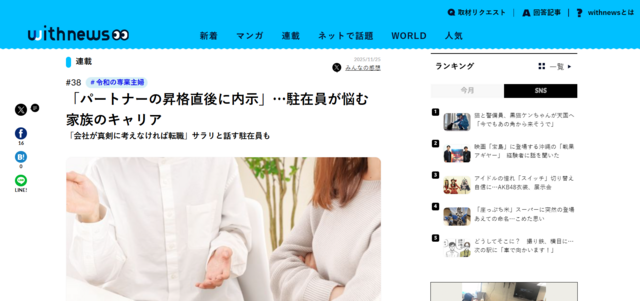 朝日新聞社が運営するwithnewsに、駐在員パートナーのキャリア支援・人材紹介に携わってきた立場としてCAREER MARKキャリアコンサルタント小橋のコメントが掲載されました。