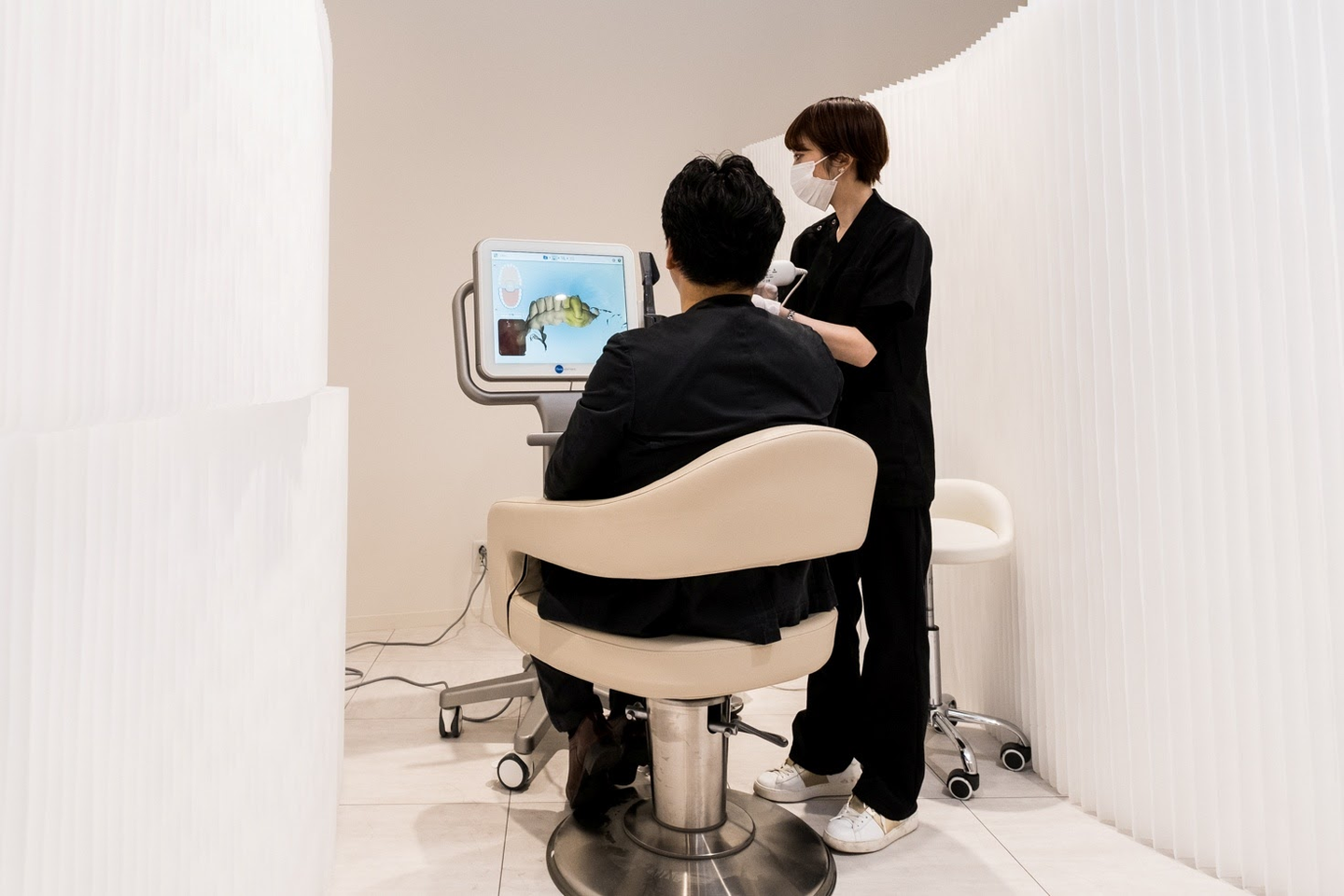 はい。まずはOh my teethの特徴である「通院不要」と「矯正版ライザップ」について説明します。Oh my teethは最初に表参道にあるOh my teeth専門の矯正歯科クリニックで、無料の歯型スキャンをとってもらいます。所要時間は30分で、自分の歯並びを3Dで見ることができるんです。しかも、レントゲン撮影までおこなって無料。初診料もかかりません。