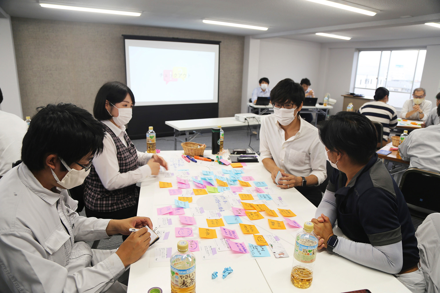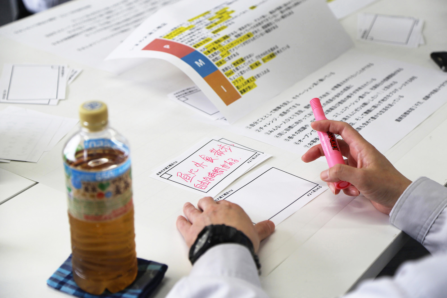 大滝社長率いるこちらのグループでは、模造紙が付箋だらけになりました・・!話し合うなかでは、どんな空間にしようか、どんなツールを使えばいいか、具体的に考えるフェーズに入るとあまり想像が浮かばなくなることもありました。そんな時に役に立ったのが、ウエダ本社さんが用意してくださったアイディアカード。参考となるアイディアの要素が書かれており、話し合いのなかでは生まれなかった視点がどんどん浮かび上がってきました。