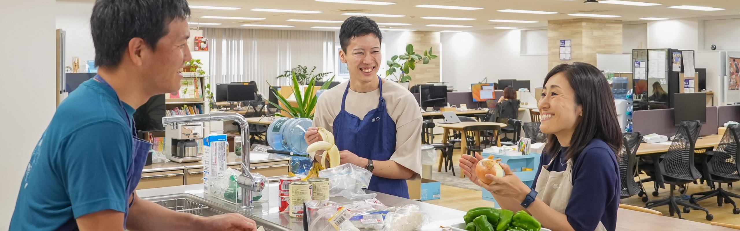 オフィスには大きなキッチンがあり、冷蔵庫の食材は無料で自由に使えます。ランチタイムやイベントでは、社内の管理栄養士とともに、おいしく健康的な食事を楽しむことができます。