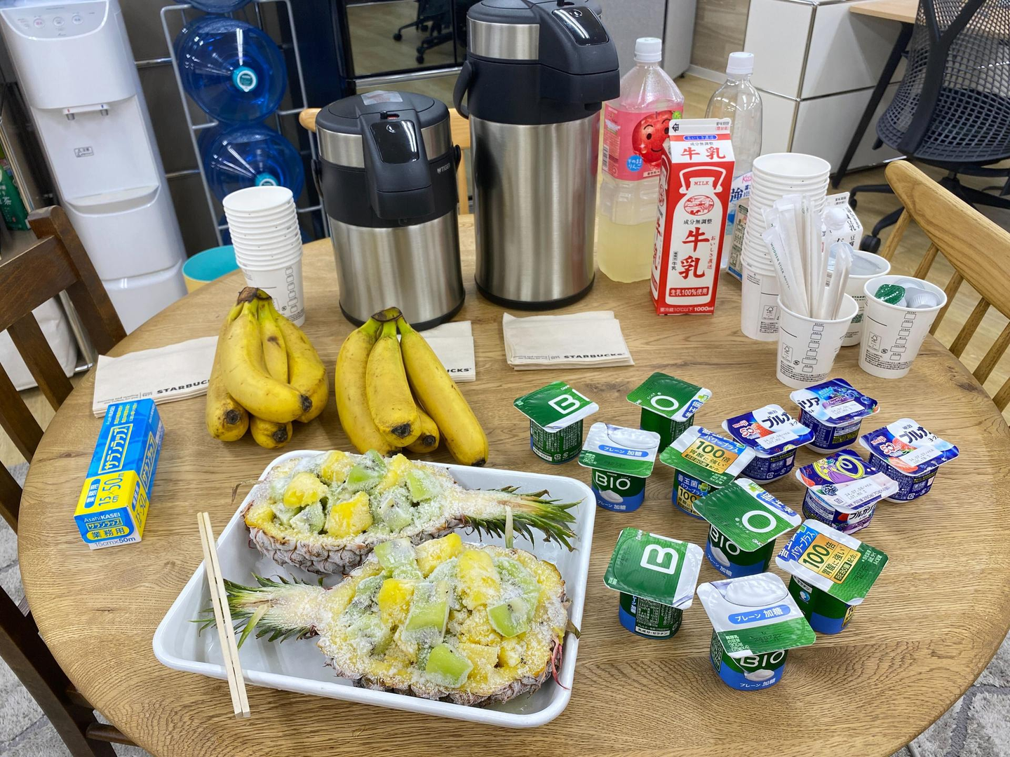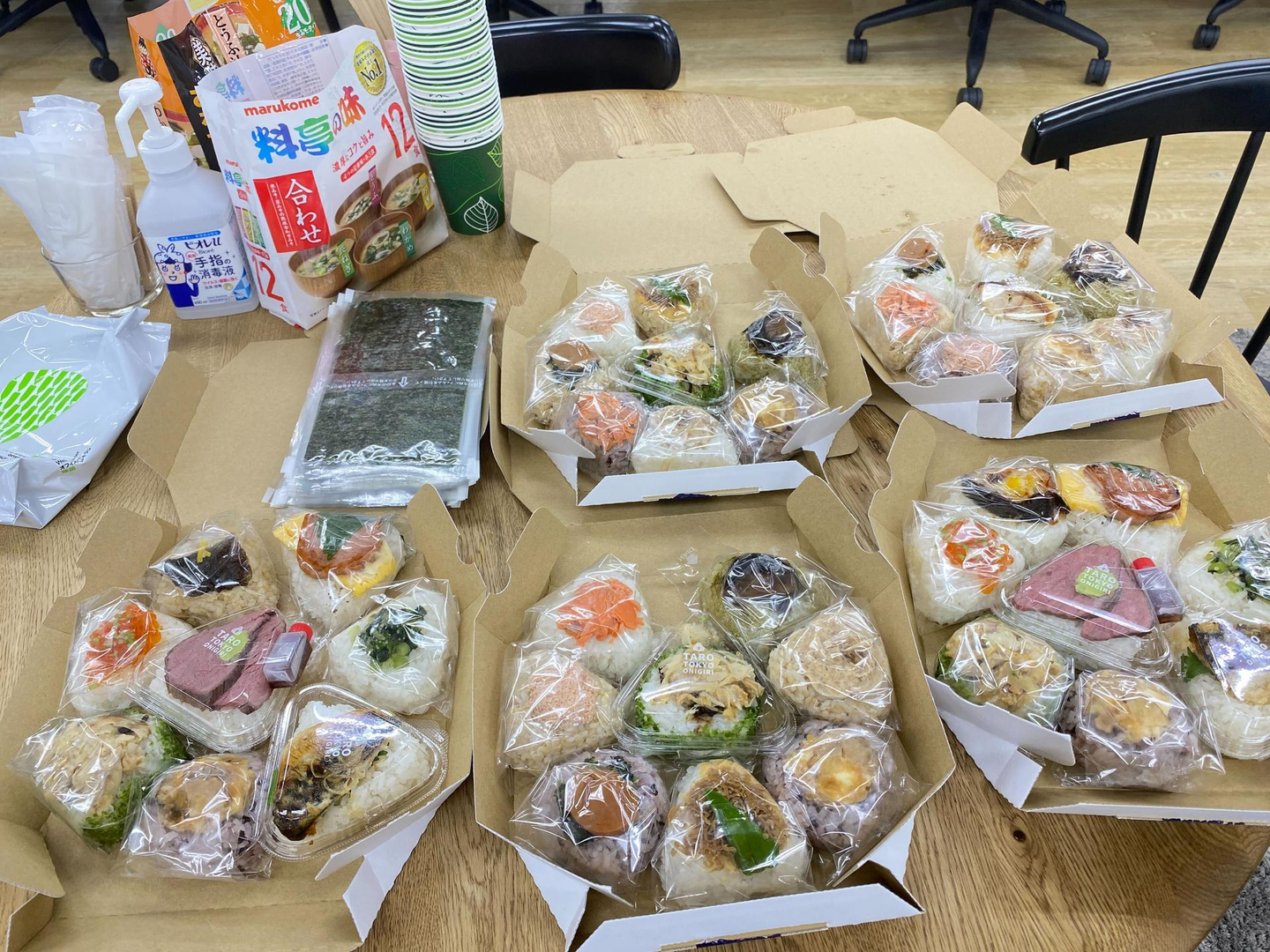 全体会議では、朝食を用意しています。近所のおにぎり屋さんのおいしいおにぎりやサンドイッチ、フルーツ、スープ、コーヒーなどあり、各自好きなものを選びます。