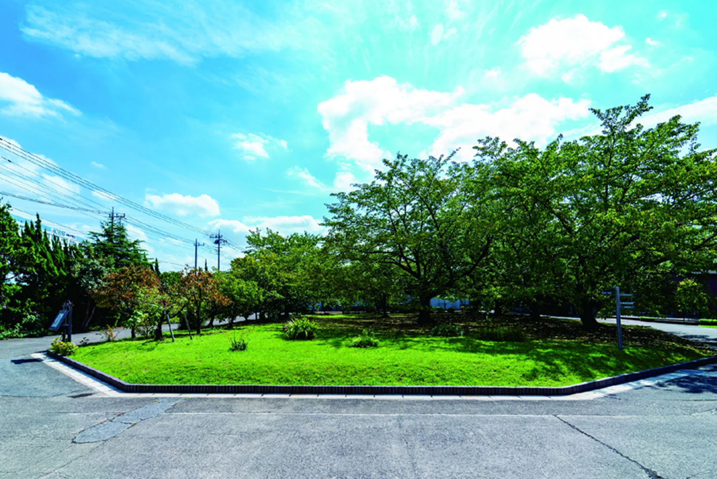 3,000坪の敷地を有する本社「OKS CAMPUS」。春夏秋冬の移ろいを感じられる最高のロケーション。隣接するプラントベースカフェ「1110 CAFE/BAKERY」のテラスも最高!