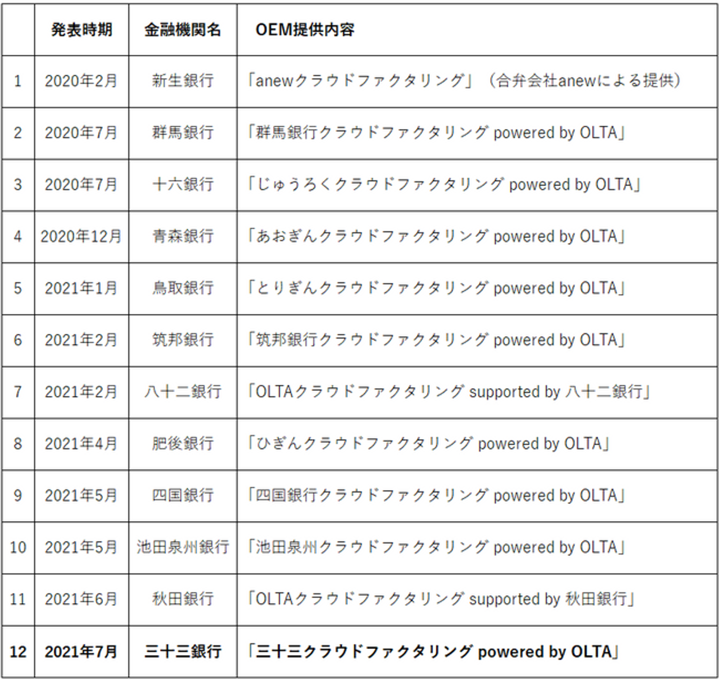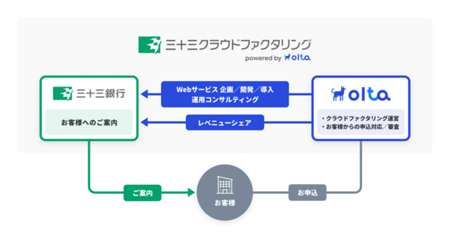 日本初のオンライン型ファクタリングサービス「クラウドファクタリング」を提供するOLTA株式会社(代表取締役社長兼CEO:澤岻 優紀、以下、OLTA)は、株式会社三十三銀行(取締役頭取:渡辺 三憲、以下、三十三銀行)と共同で「クラウドファクタリング事業」を立ち上げ、「中小企業の日」である2021年7月20日よりサービス提供を開始します。