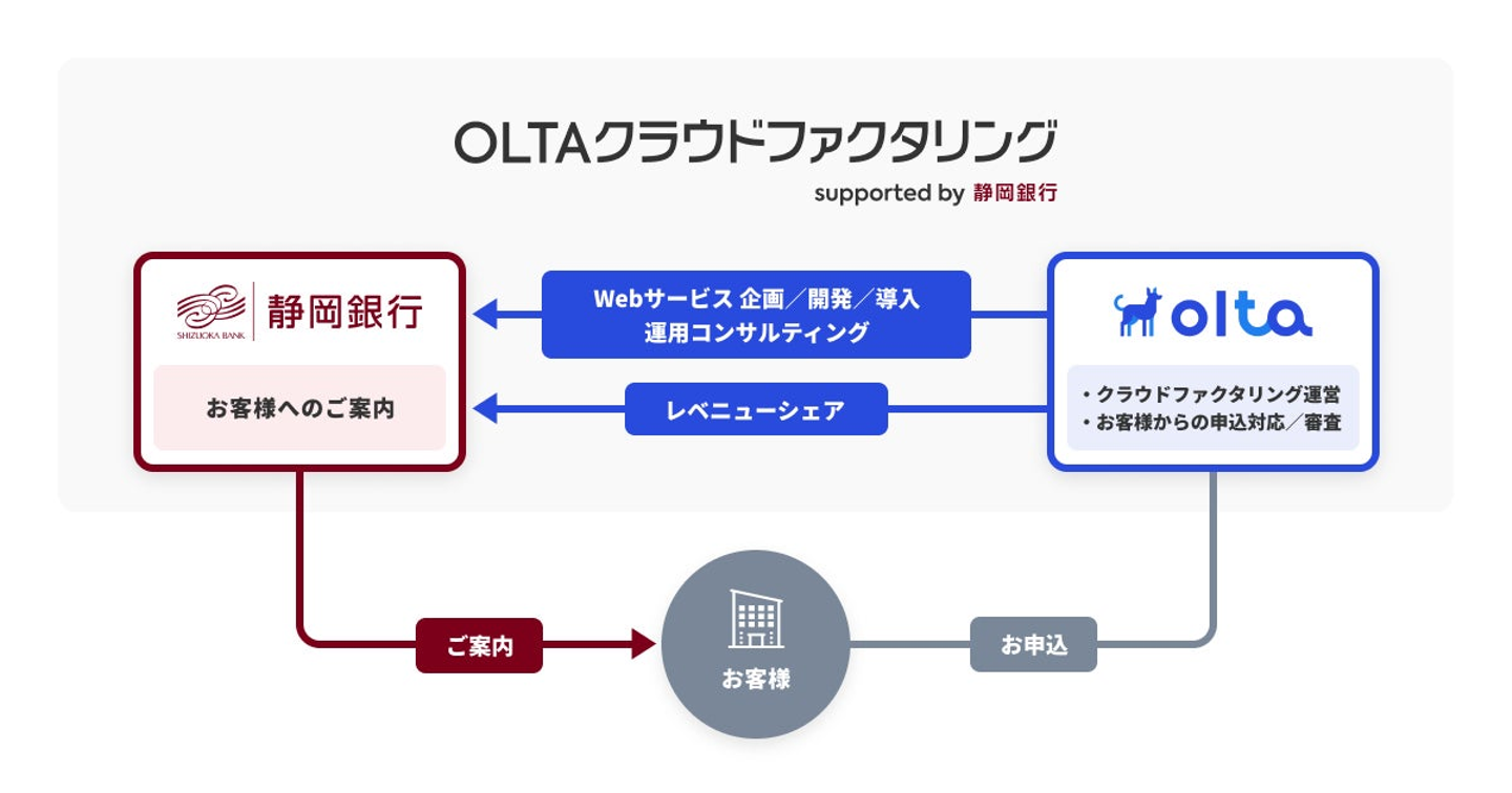 日本初のオンライン型ファクタリングサービス「OLTAクラウドファクタリング」を提供するOLTA(オルタ)株式会社(代表取締役社長兼CEO:澤岻 優紀、以下「OLTA」)は、株式会社静岡銀行(代表取締役頭取:柴田 久、以下「静岡銀行」)と共同でクラウドファクタリング事業「OLTAクラウドファクタリング supported by 静岡銀行」を立ち上げ、2022年3月7日よりサービスの提供を開始します。