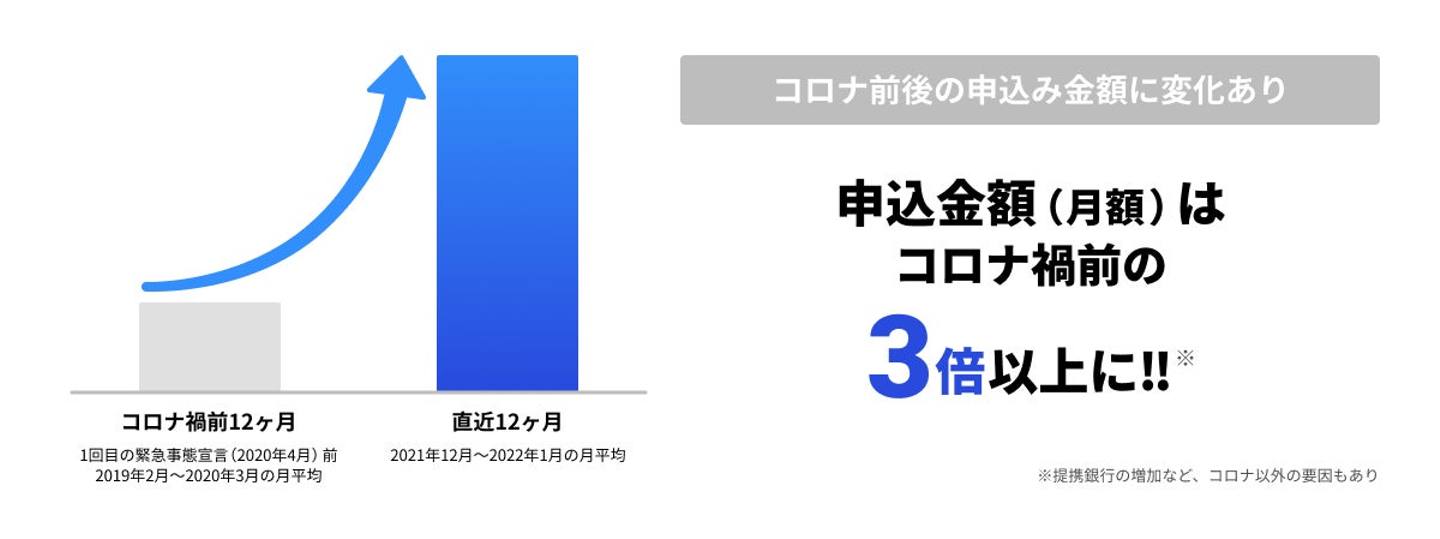 近年、中小企業の新たな資金調達として、テクノロジーを活用した代替的な金融手法「補完金融(オルタナティブ・ファイナンス)」が注目されており、「OLTAクラウドファクタリング」に代表されるオンライン型ファクタリングの利用も急速に拡大しています。コロナ禍で資金繰りに困る中小企業様が増えていること、コロナ禍の非対面ニーズにマッチすることなどから、「OLTAクラウドファクタリング」を利用される企業様は急激に増加しています。(下図)