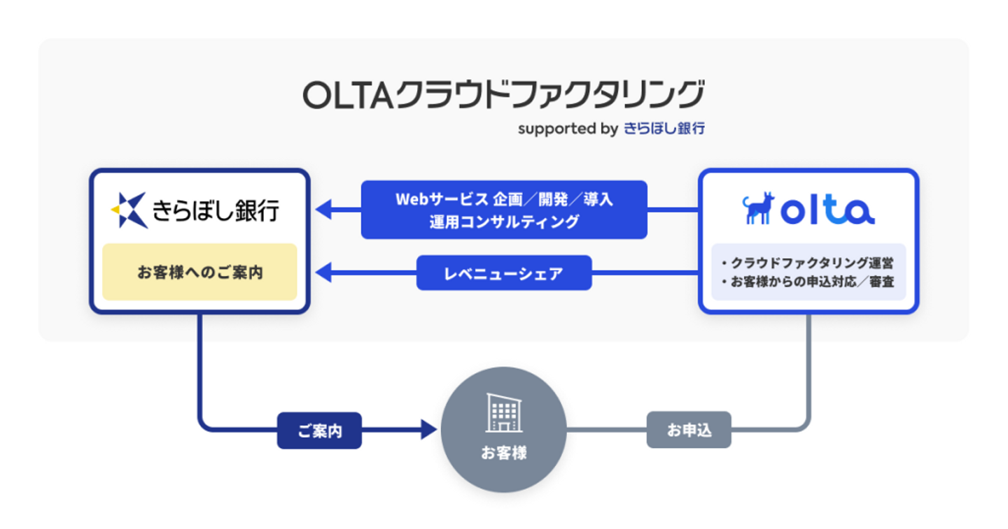 OLTAときらぼし銀行とのクラウドファクタリング事業における提携では、OLTAがWebサービスの企画・開発・導入および運用におけるコンサルティングをきらぼし銀行に提供し、きらぼし銀行は自社ブランドの金融商品のサービスラインナップに加え、法人・個人事業主のお客様にご案内します。