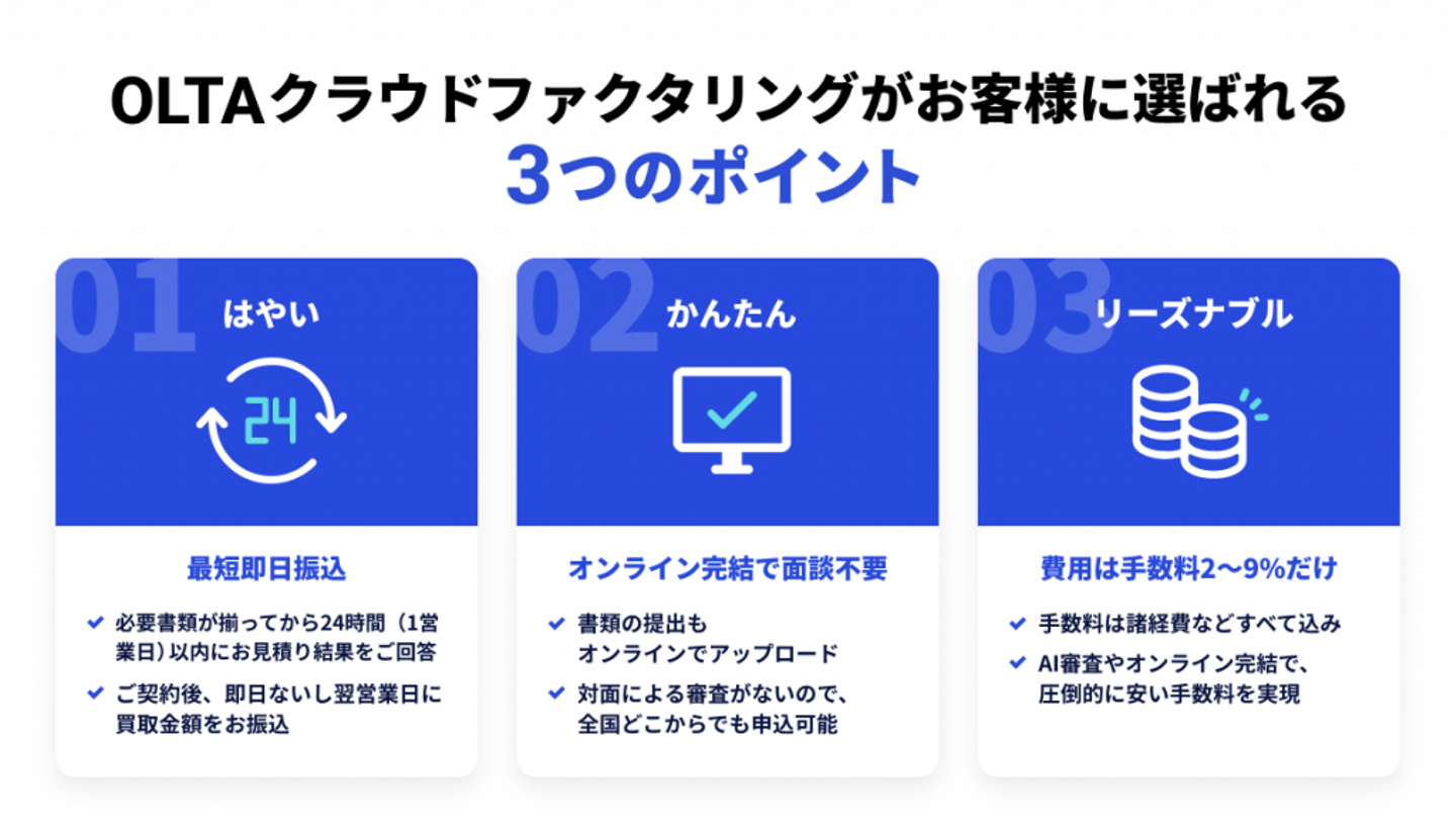 ファクタリングとは、企業が商取引で発生した「入金待ちの請求書」を売却して、早期に運転資金を調達する手法です。OLTAは、2017年に日本初のオンライン型ファクタリングである「OLTAクラウドファクタリング」の提供を開始したパイオニア企業です。AIを活用した審査などにより「はやい・かんたん・リーズナブル」なサービスを実現。「提携銀行数No.1」※で多くの中小企業様にご利用いただいており、累計申込金額は900億円を超えています。