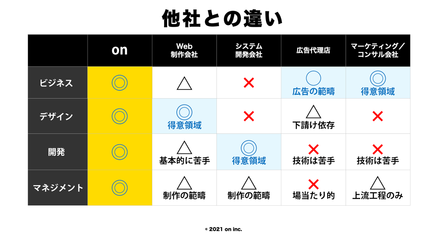 ところがonには上記4つの領域を得意とするメンバーが揃っているので、ワンストップでプロジェクトを遂行することができます!