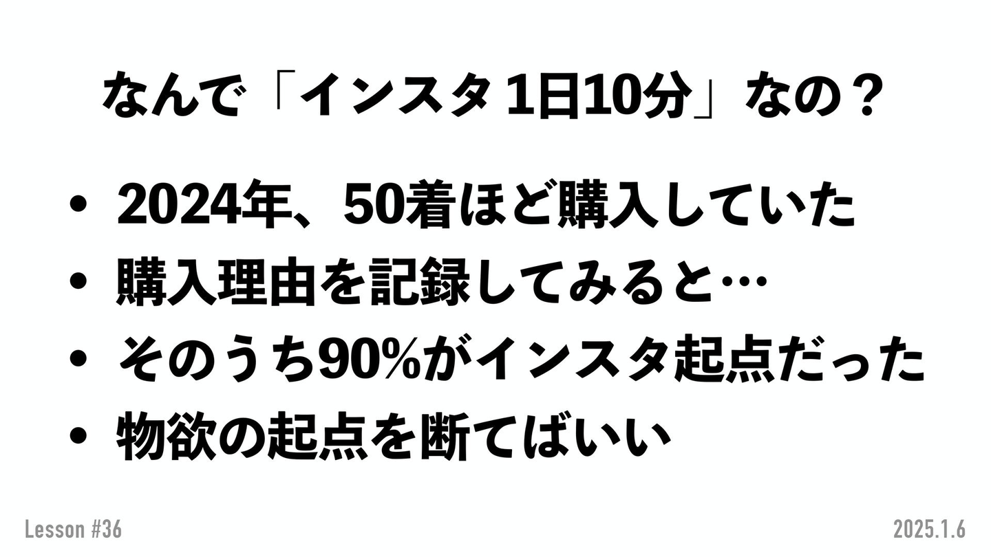 私、実は2024年の1月からスマホのアプリ利用時間をレコーディングしていたんですよ。で、年末記録を見て分析したところ結論、50着購入してまして、45着が通販経由でした。インスタで一目惚れ→オンラインサイトに飛ぶ→購入!を繰り返していたわけです。 なので、インスタを見なければ買い物しなかったということなので、物欲の起点を絶つという行動が大事になるんです。 要するに…