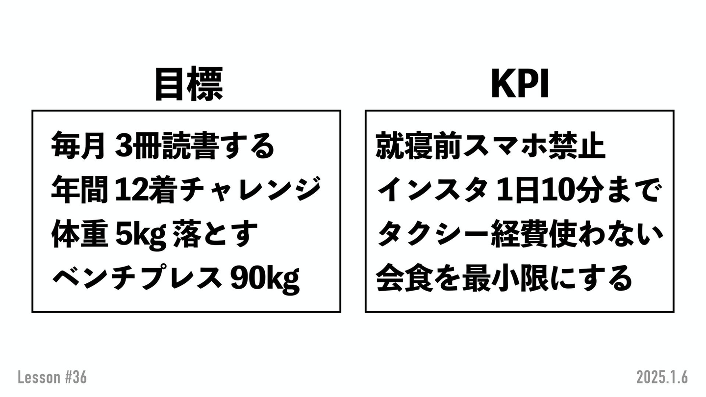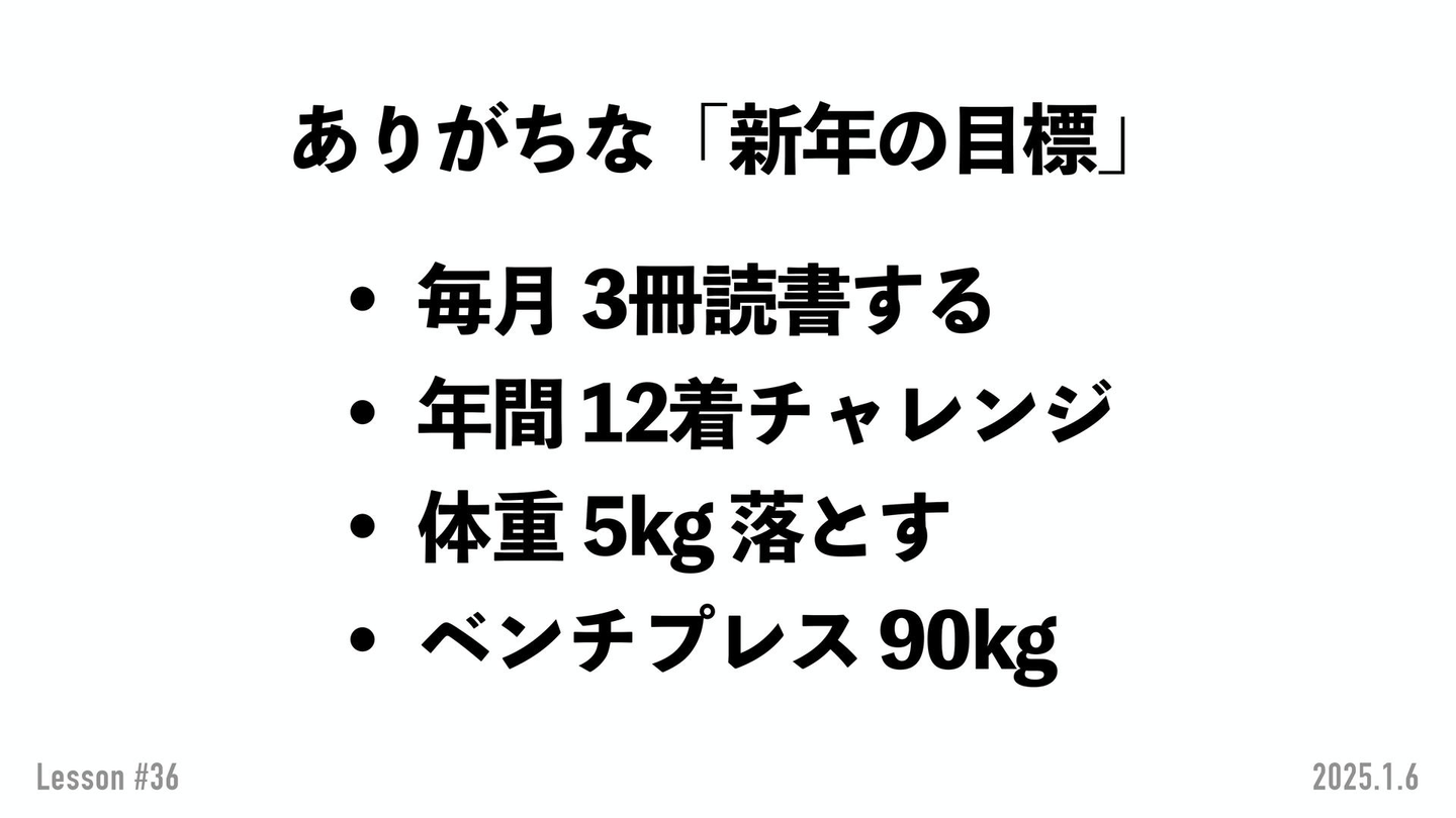 年間12着チャレンジって知ってますか?巷のファッション系ミニマリスト界隈ですごく流行っているチャレンジらしいです。あとは減量&ベンチプレス90kgをあげる、とかとか..。 これらは、ほぼほぼ未達が運命付けられているんですよね。ちなみにこれ全部、私の去年やりたかったものであり、全然達成しなかった目標なんですよね。おそらく、寺内くんの目標である「仕事頑張りたいっ」ていうのはおそらく達成はしないです。年末頃には「もっと頑張れたな」って思うはずなんです。じゃあ、どう考えるかというと…
