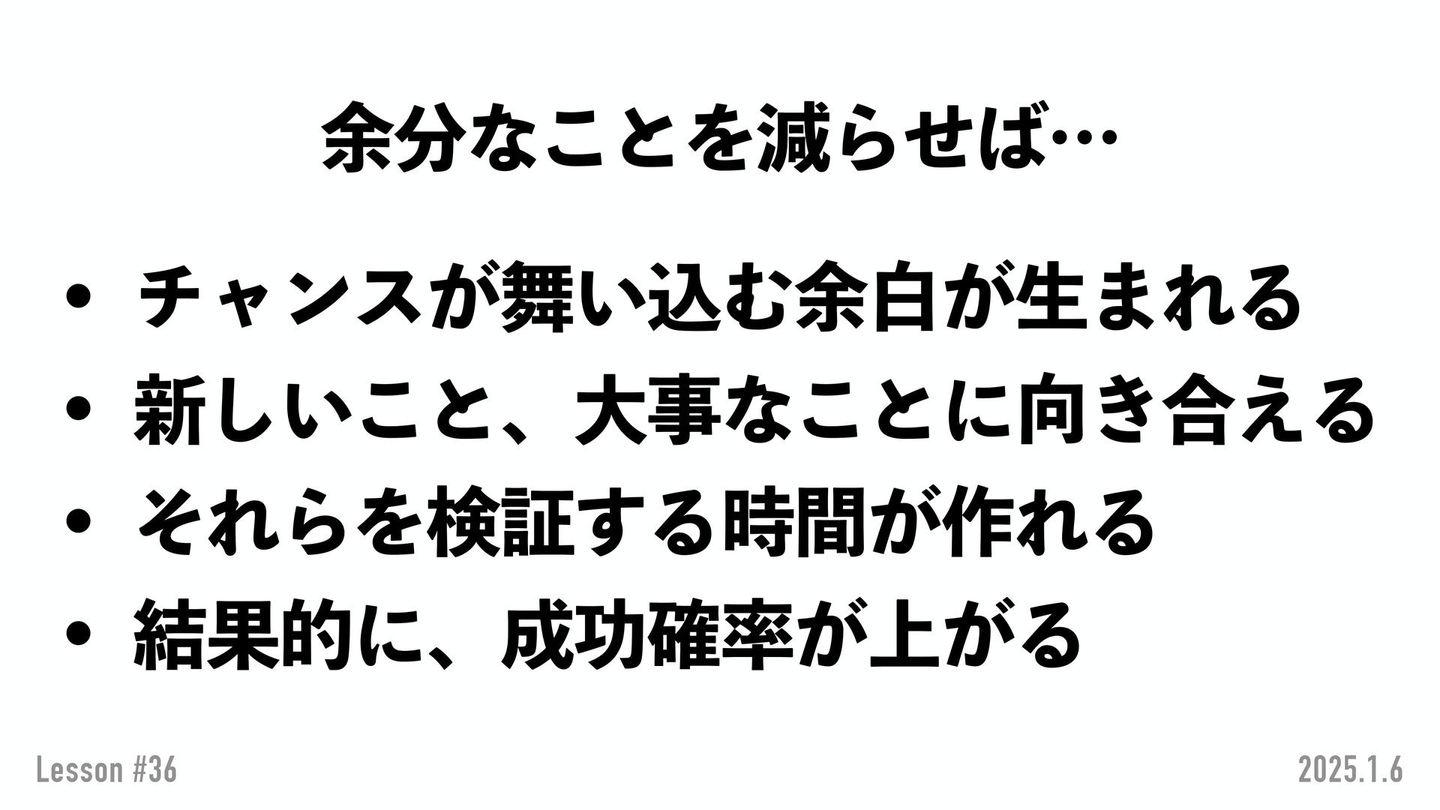 余分なことを減らすと、 チャンスが舞い込む余白が生まれる わけです。 大事なことに向き合えて、結局それが来たときに本当にここから5年・10年と見据えた時に大事なことなんだろうか?と考えたり、検証したりする時間が作れて、 結果的に成功確率が上がる 。