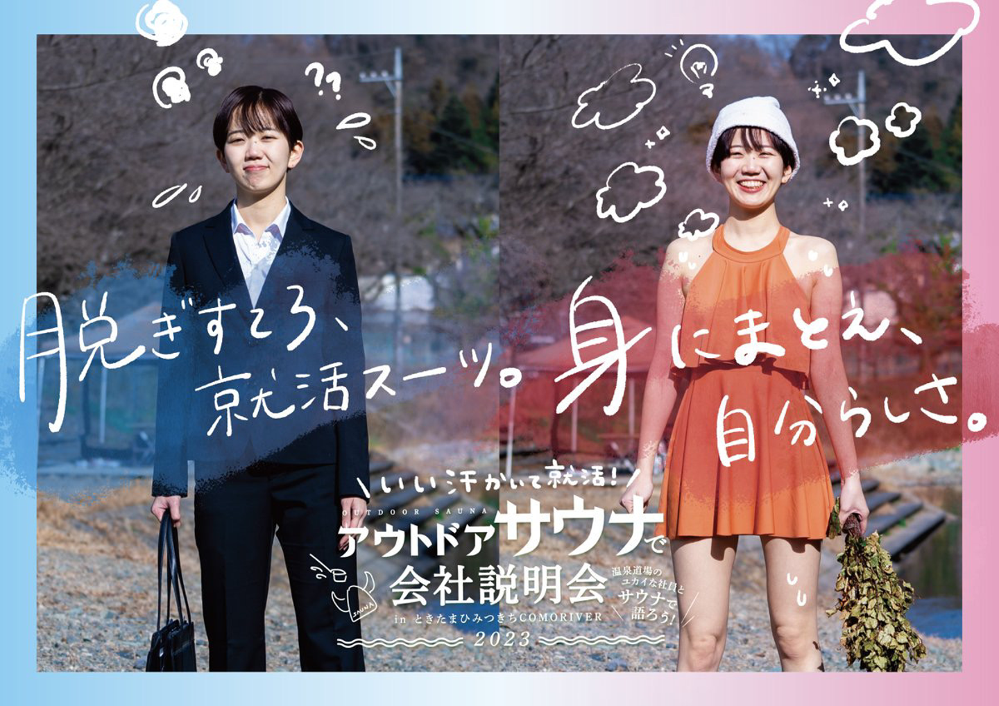 ときたまひみつきちCOMORIVERで開催される、アウトドアサウナに入りながらメンバーとお話できちゃう温泉道場独自のイベントです! なんとサウナの中で社長の山崎さんともお話する機会が…!? 毎年サウナが好きな方にも多くご参加いただいております。中にはこのイベントをきっかけにサウナに目覚める人もいるとかいないとか。温泉道場メンバーとたくさん話すイベントのため、こちらにご参加いただいた方は2次面接からのスタートに! 昨年の様子はこちらからご覧いただけます!