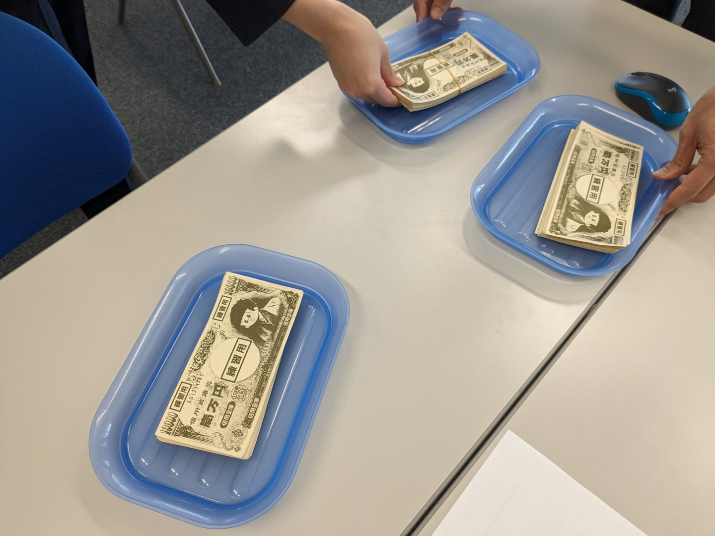 他にも、「札勘大会」を開催! およそ100枚の札束を数えるスピードを競います。枚数は100枚なのか99枚なのか98枚なのか…。今回は模擬紙幣で行いましたが、これがもし本物だったら間違いは許されません。緊張感の漂うなか数えていきました!