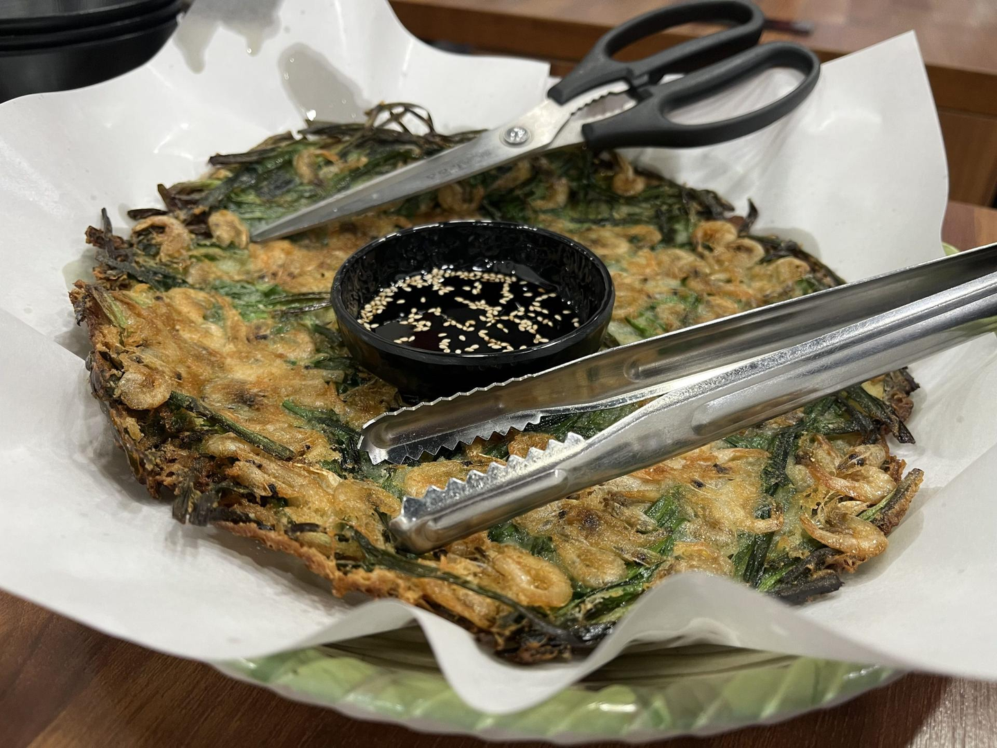 1日目の夕食で行ったチュダム市役所北昌店では、タコ料理とサムギョプサルを食べました。特に、エビのチヂミはパリパリで絶品でした。