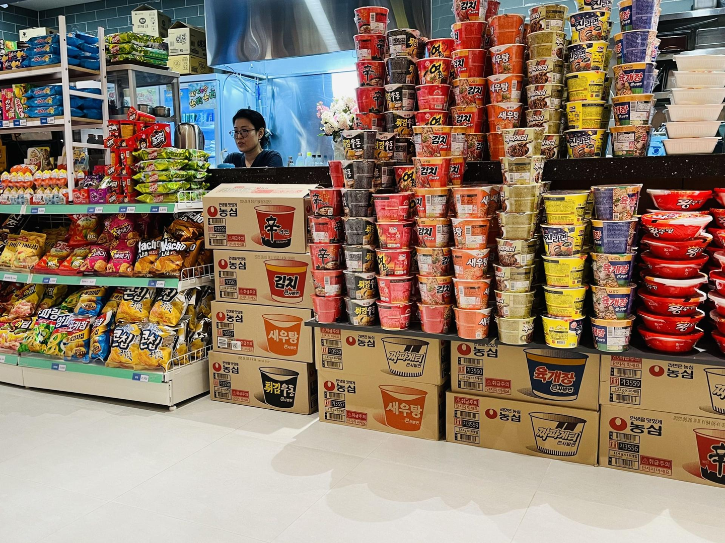 積み上がる即席ラーメン。カラフルでインパクトがありますね。