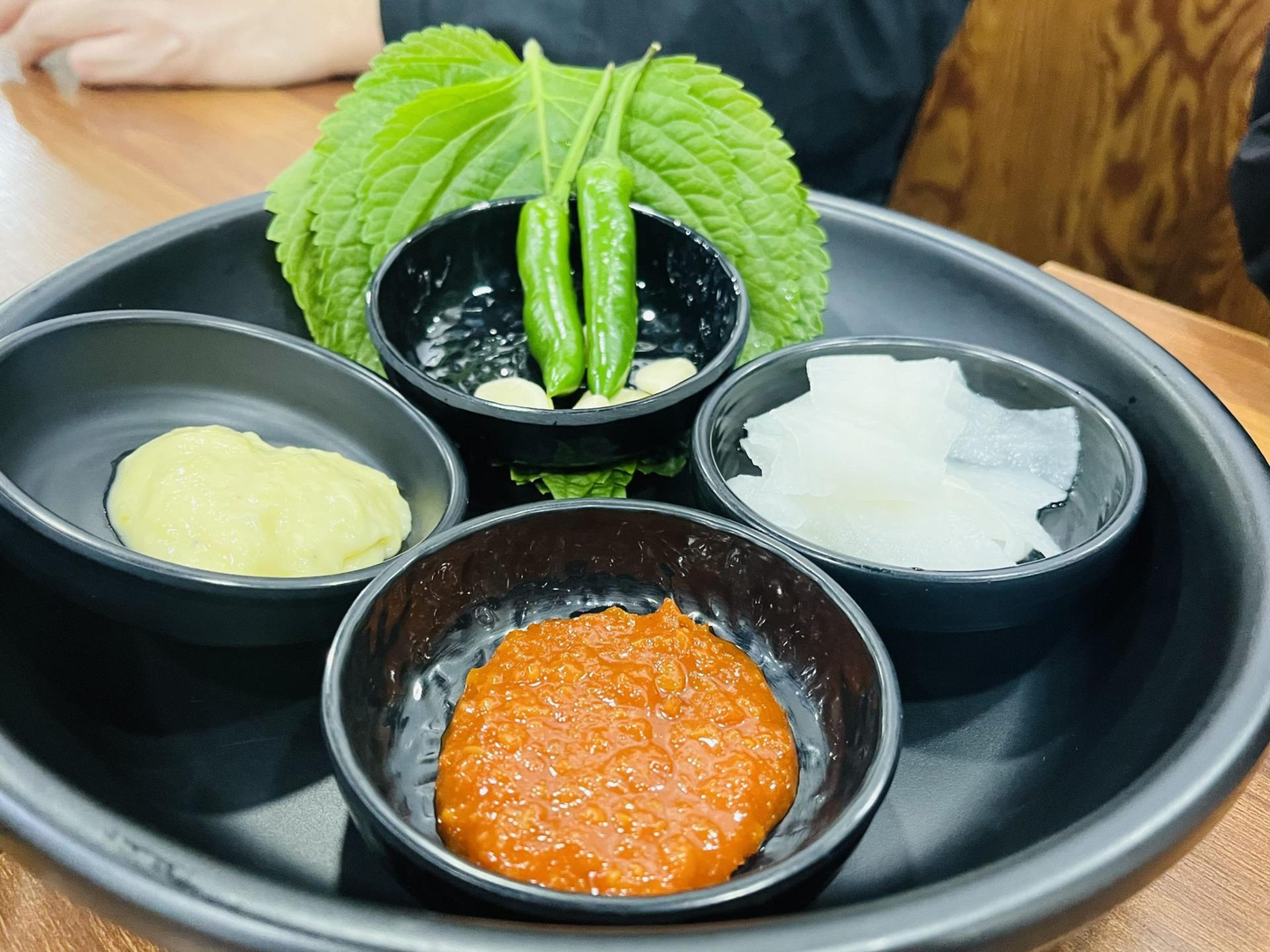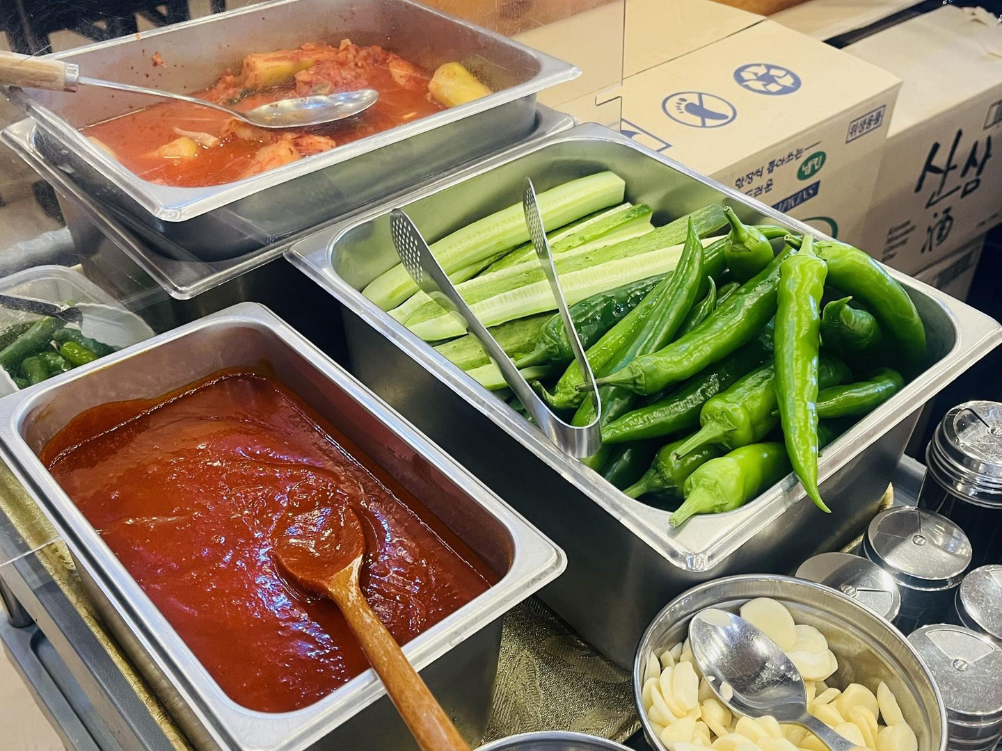 周りのお客さまを見てみると、右手にスプーン、左手には緑の野菜。あれは……唐辛子!? セルフサービスのテーブルには、巨大なキムチと、辛さが異なる2種類の唐辛子(辛いもの/辛くないもの)が並んでいました。