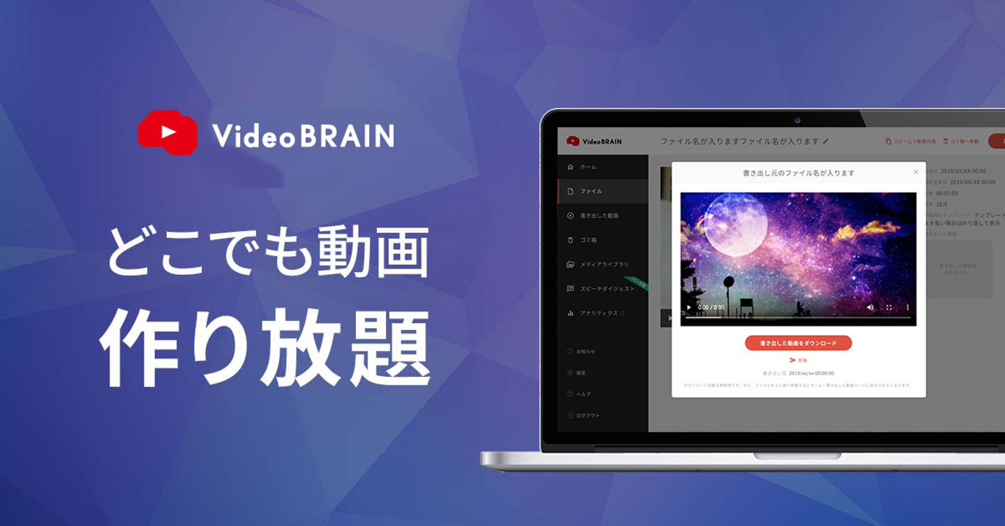 「誰でも簡単、どこでも動画作り放題。」のインハウスAI動画編集クラウドVideo BRAINは、AIのサポートで誰でも簡単に高品質なストーリー性のある動画を数分で編集できるクラウドサービスです。未経験者のために作りこまれた操作画面で、まるでパワーポイントを使う感覚で動画を簡単に作成することができ、業界問わず多くの企業が導入。これまで外注していた動画作成が社内でできるようになり、コストも時間も抑えられると高い評価を得ています。