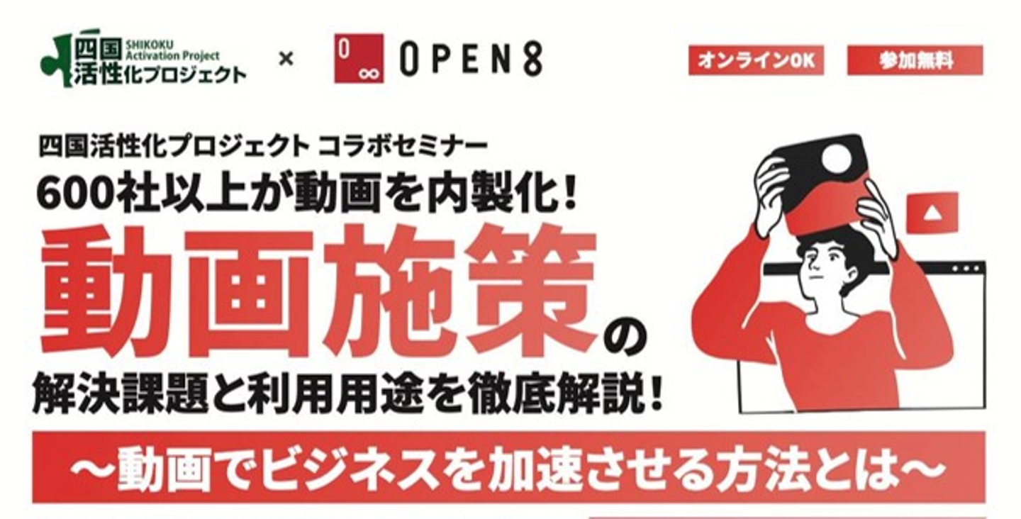 ビジネスマッチングやビジネスアライアンスなど、様々な角度での企業間のコラボレーションを創出する「四国活性化プロジェクト」とオープンエイトがタッグを組み、「四国活性化プロジェクト コラボセミナー」を開催。本セミナーにはパートナーセールスをリードする部長の井上が登壇し、600社以上の導入企業実績を持つ、ビジネス動画編集クラウド「Video BRAIN(ビデオブレイン)を通じての動画内製化に関するケーススタディなどをご紹介しました。