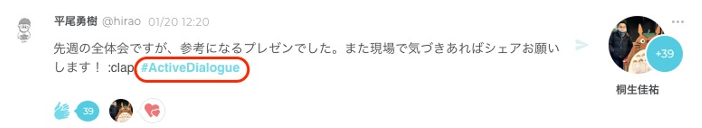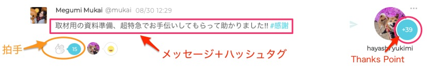 バリューに沿った素敵な行動を見つけたら、いつものポイント+メッセージに、バリュータグを添えて送ります。社内ではこんな風に使われています。