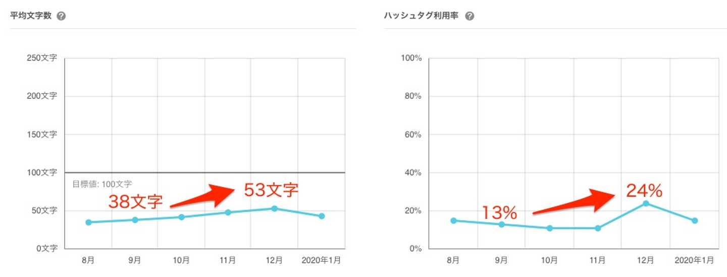 また運用していくなかで変化が見られたのが、平均文字数とハッシュタグの利用率。利用開始からじわじわとUPしています!この調子で、さらに伸ばしていきたいところです。