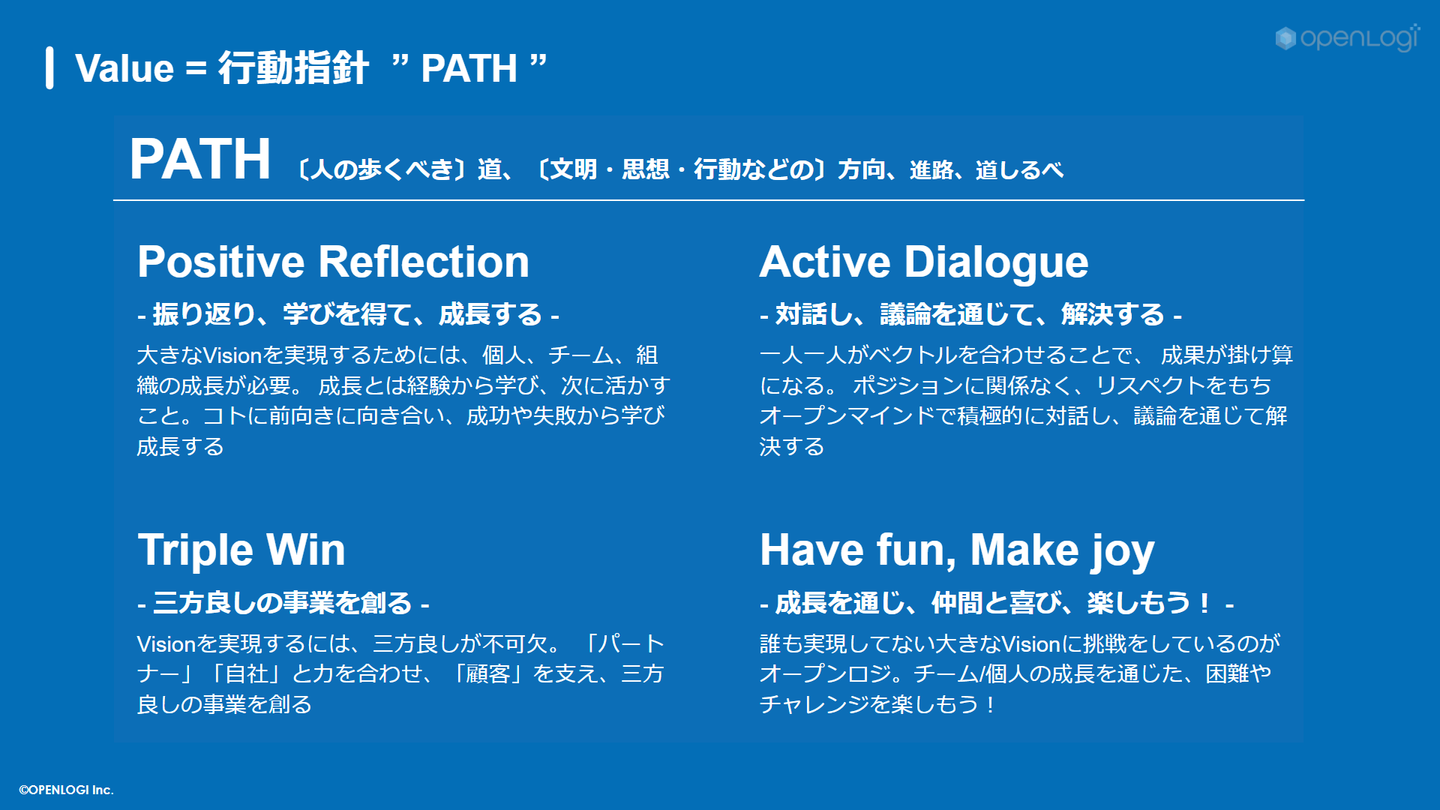 振り返りの中ではオープンロジがこれまでに達成してきたことだけでなく、できていなかった部分、目標達成のために不足している部分にも言及。オープンロジのバリューの一つである「Positive Reflection」が体現され、目標に向けて一歩一歩道を歩み業界を変えていく、という強い想いが感じられる内容となりました。