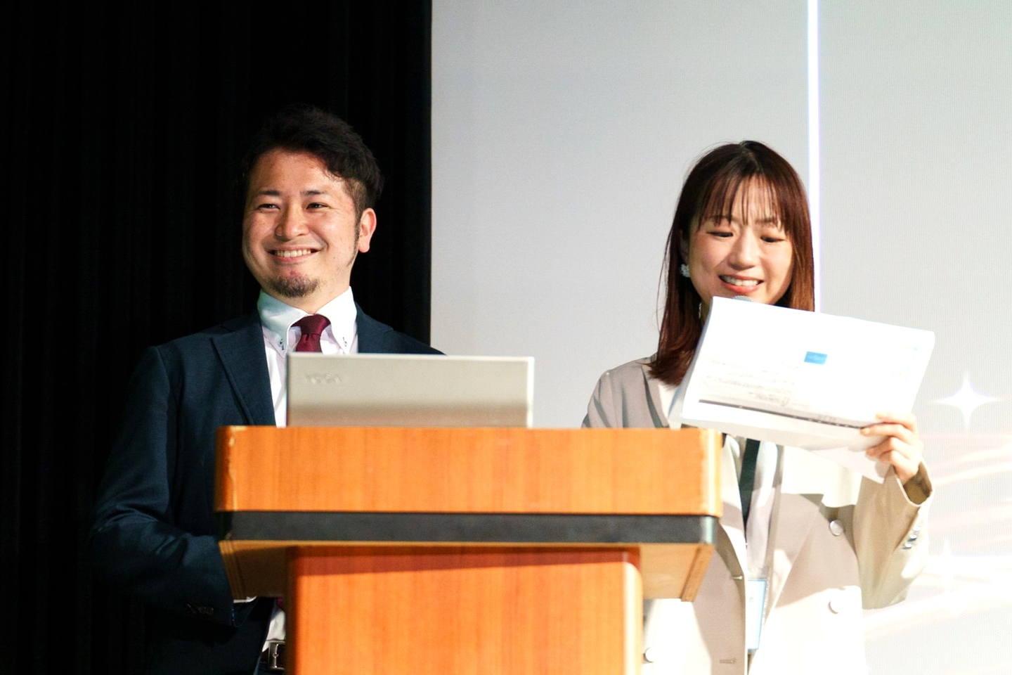 Kickoffで司会を務めたセールスの千葉さん(左)と人事の薄波さん(右)