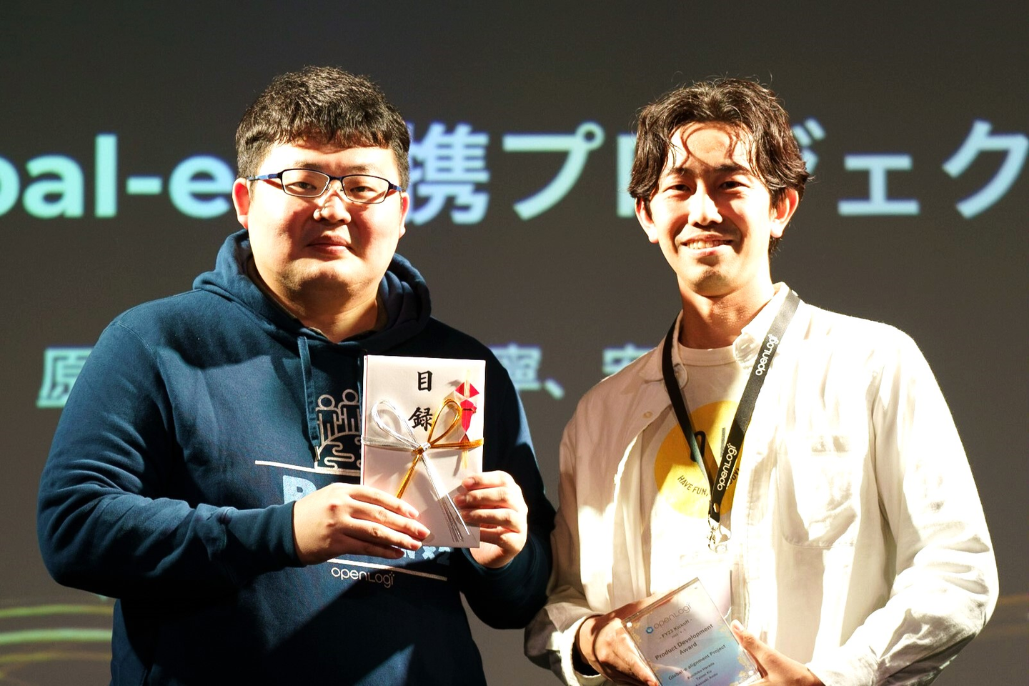 プロダクト開発賞(プロダクト開発において、オープンロジプロダクトに大きな貢献をした社員、チーム、プロジェクト)を受賞したチーム代表の、技術開発部の原田さん✨