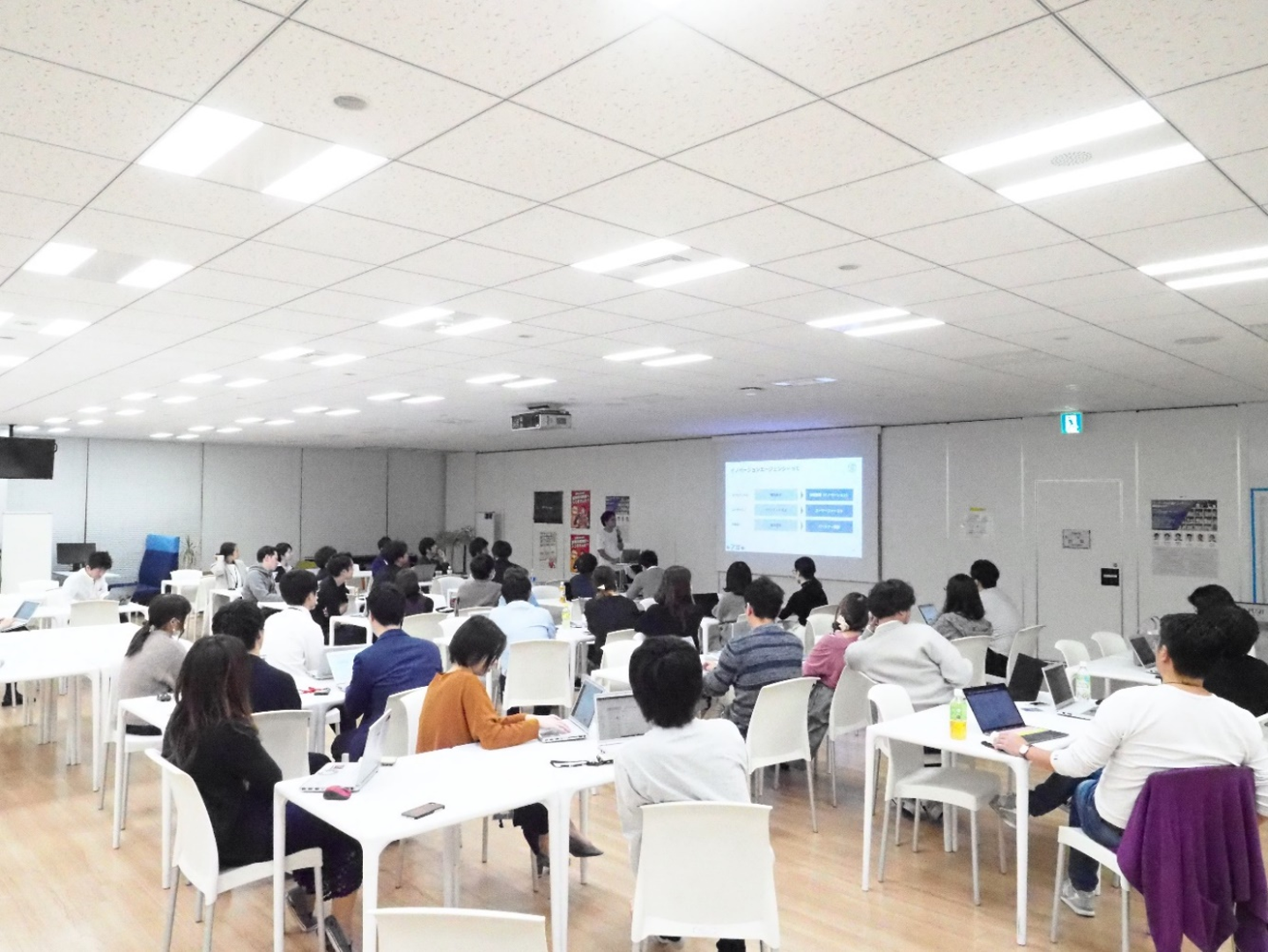 ▲キャリアにおける「自分の市場価値」の落とし穴について学生の前で演説をする前村