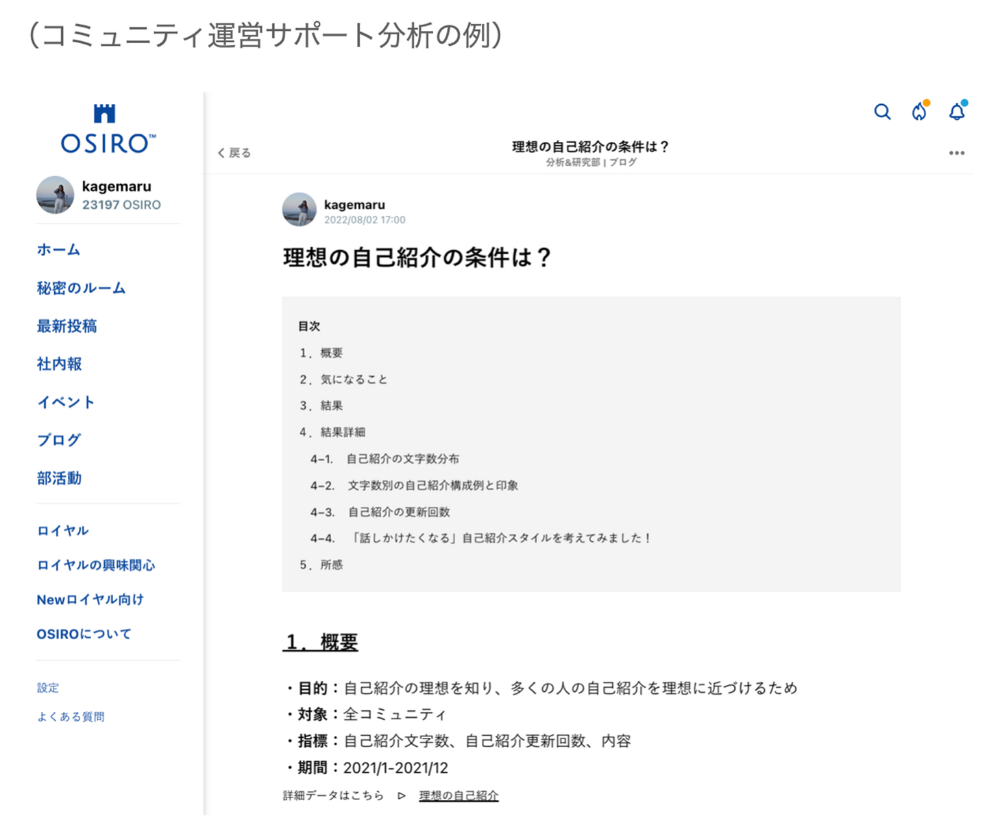 一つ目は、OSIROがリリースした機能の利用度の調査と分析です。リリースした機能について「機能がどのくらい使われているか」「コミュニティ運営者さんの役に立っているか」などのデータを集めて数字を見ながら問いを立て、「なにを改善したらより多くの運営者さんに有効活用してもらえるか」という仮説を打ち出しています。分析結果は自社サイトのブログ投稿を活用して社内に共有し、プロダクトチームやCSチームと連携して機能の改善やコミュニティ運営のサポートに役立てていきます。
