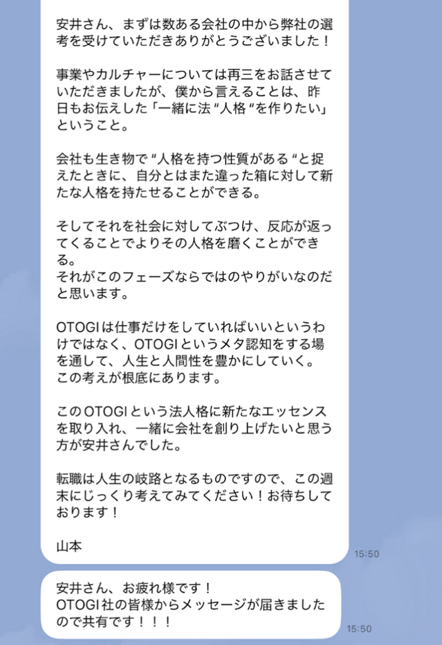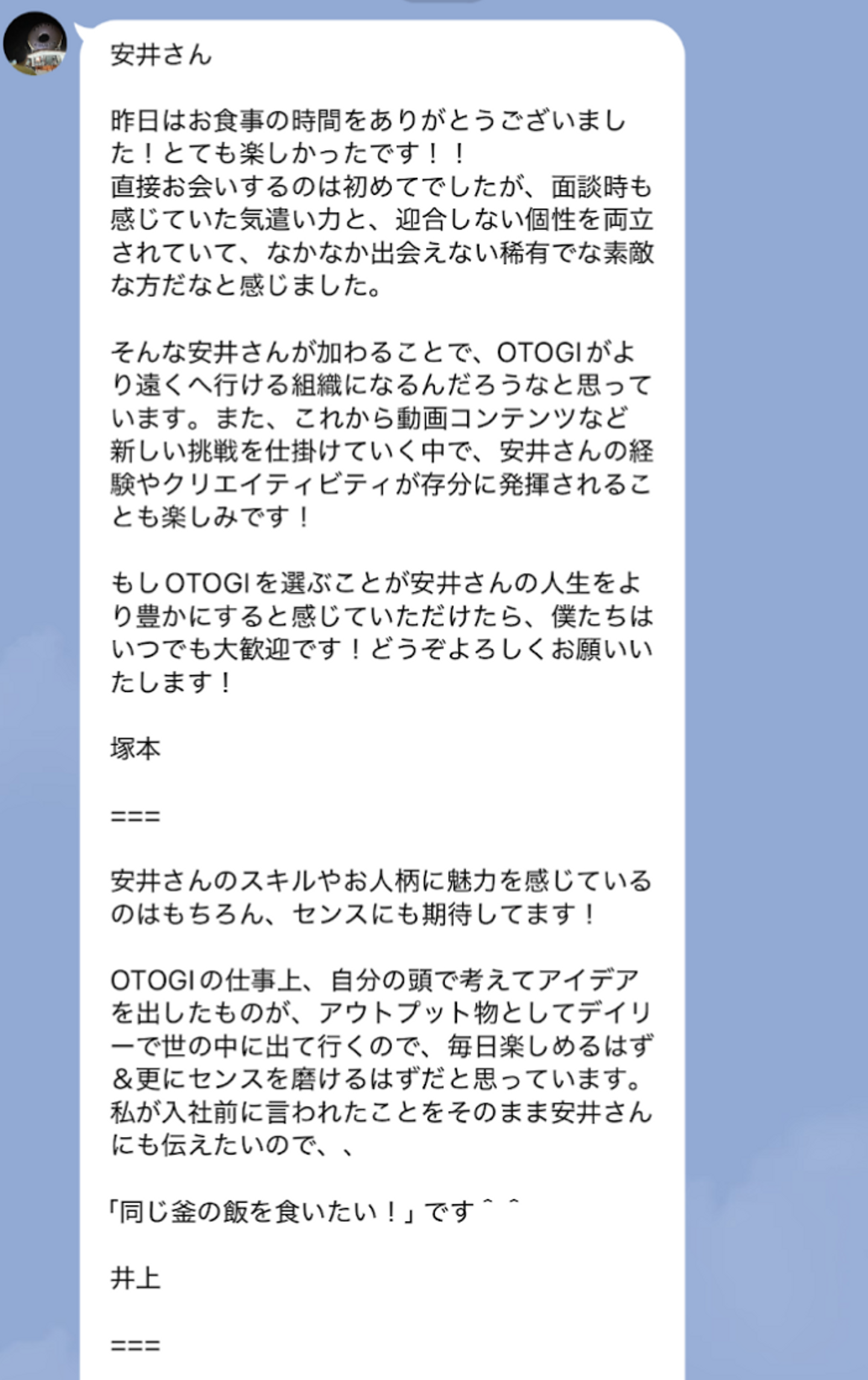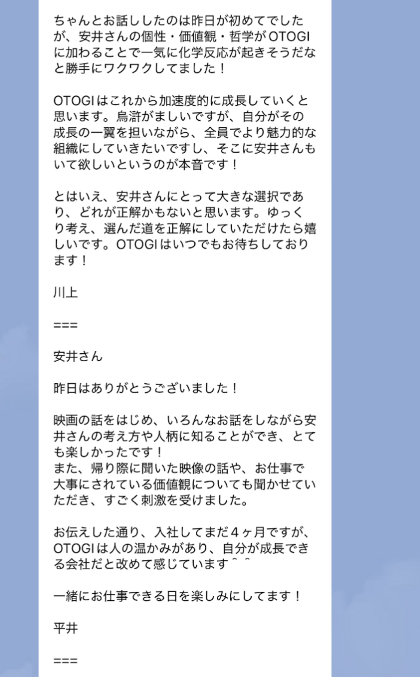 『入社への想いを決定的にしてくれたのが、翌日に皆さんから私宛に届いた「入社待ってるよ!」という一斉の温かいメッセージでした。』