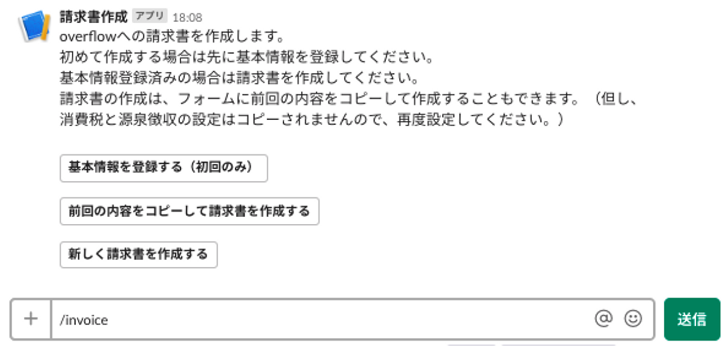 請求書入力フォームへのアクセスも、Slackでoverflowのワークスペースに登録されている方であれば、private channelで「/invoice」と入力すると、請求書入力フォームに飛ぶことができます。そして、そこから「請求書作成」にアクセスすると、前回の内容をコピーして簡単に請求書を作成することもできます。