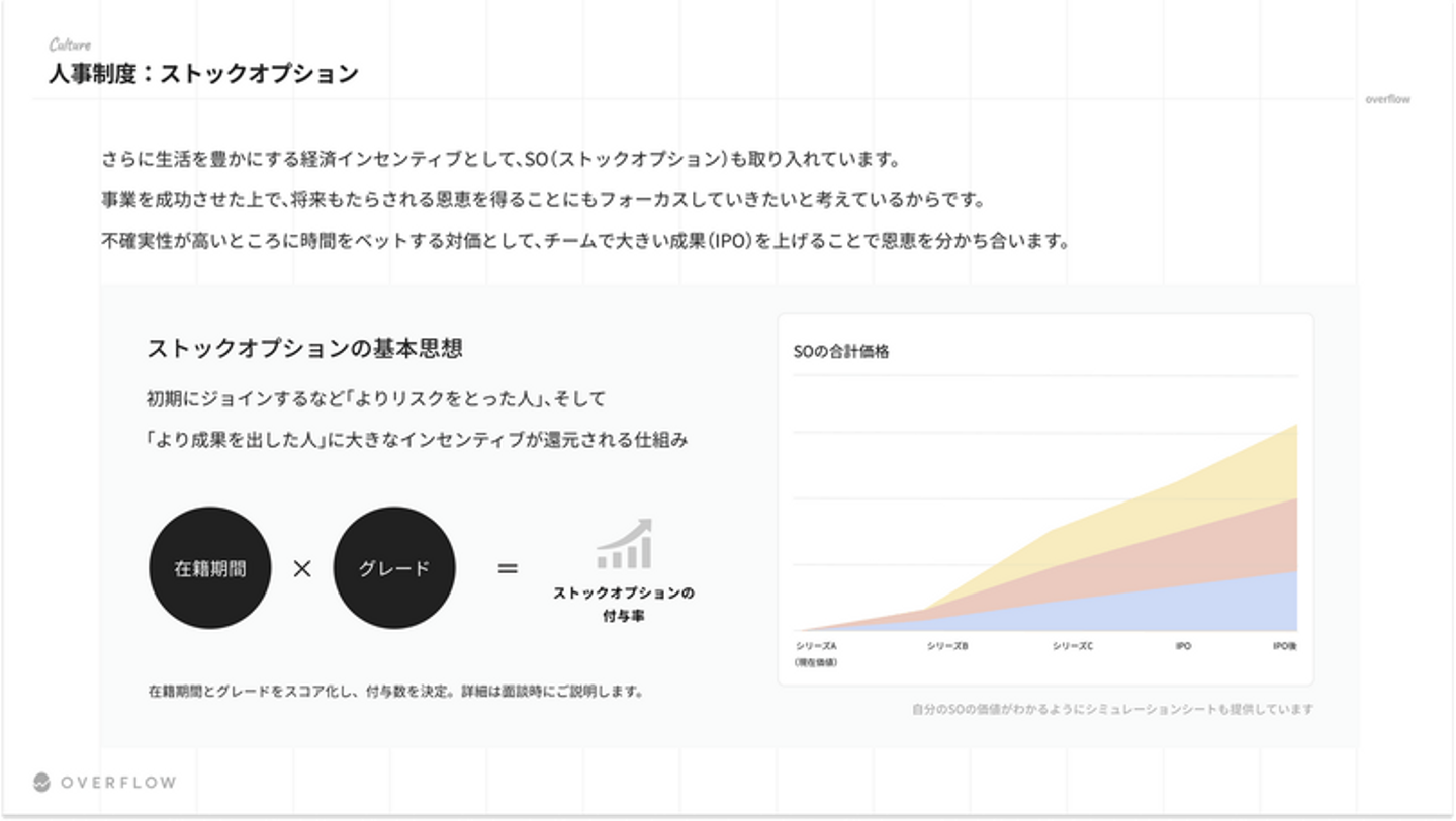 さらに、SO(ストックオプション)によって事業を成功させた上で、将来もたらされる恩恵を得ることにもフォーカスしていきたいと考えています。このSOこそ、大企業に勝るスタートアップのドライブトリガーになります。不確実性が高いところに時間をベットする対価として、チームで大きい成果(IPO)を上げることで恩恵を分かち合います。