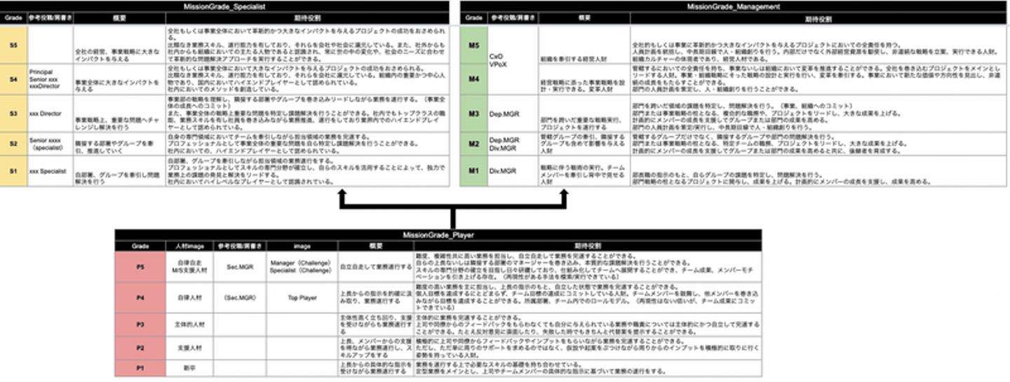 採用時、評価時に個人のスキルや経験を考慮し等級を決定。各等級ごとに期待役割とVALUE基準が設けられており、これらを考慮した目標設定と評価を行います。