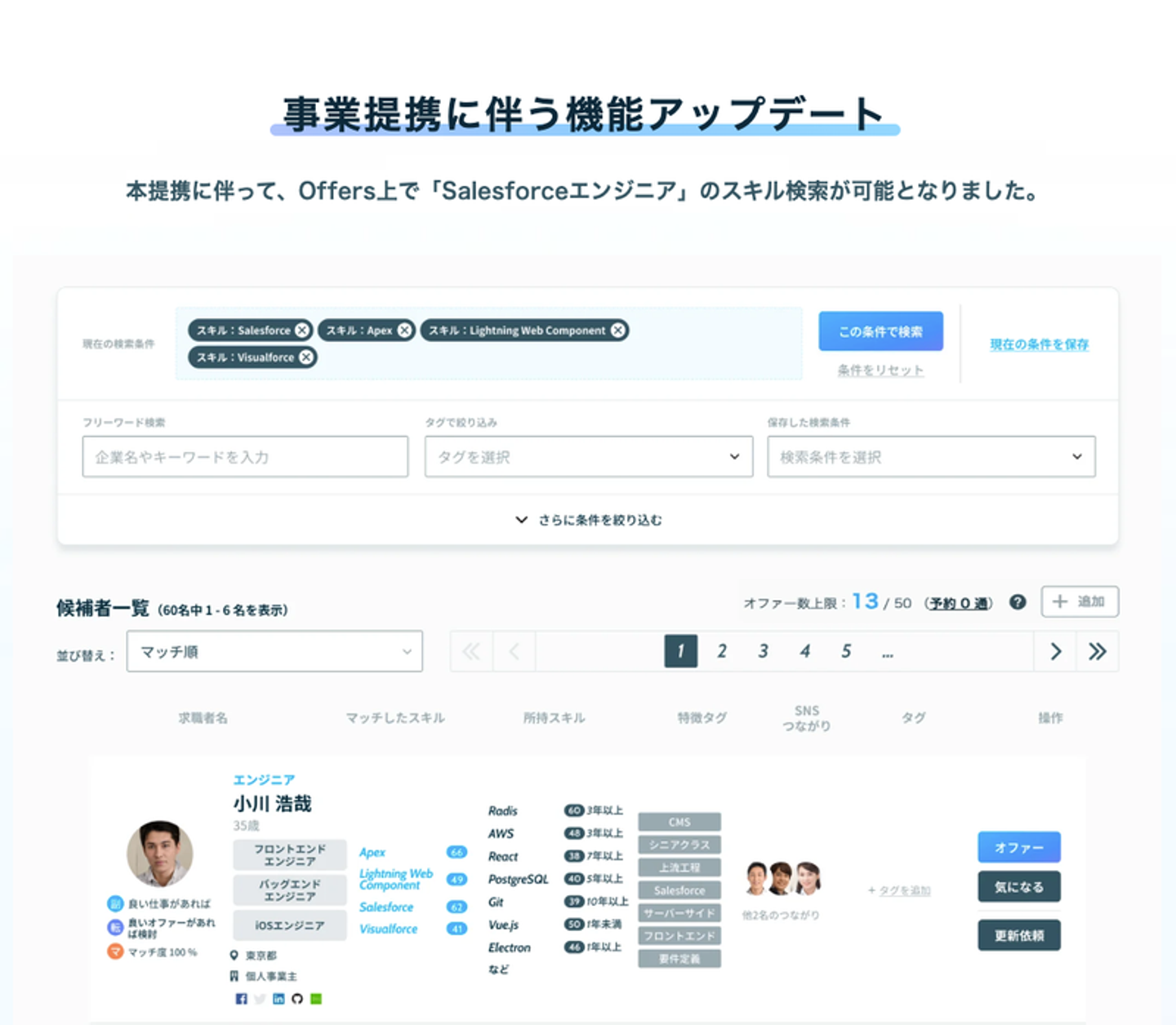 本事業提携に際し、「Offers」上ではSalesforceエンジニアのスキル検索を可能に致しました。