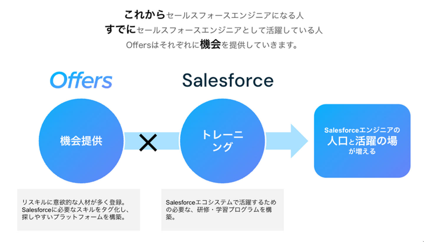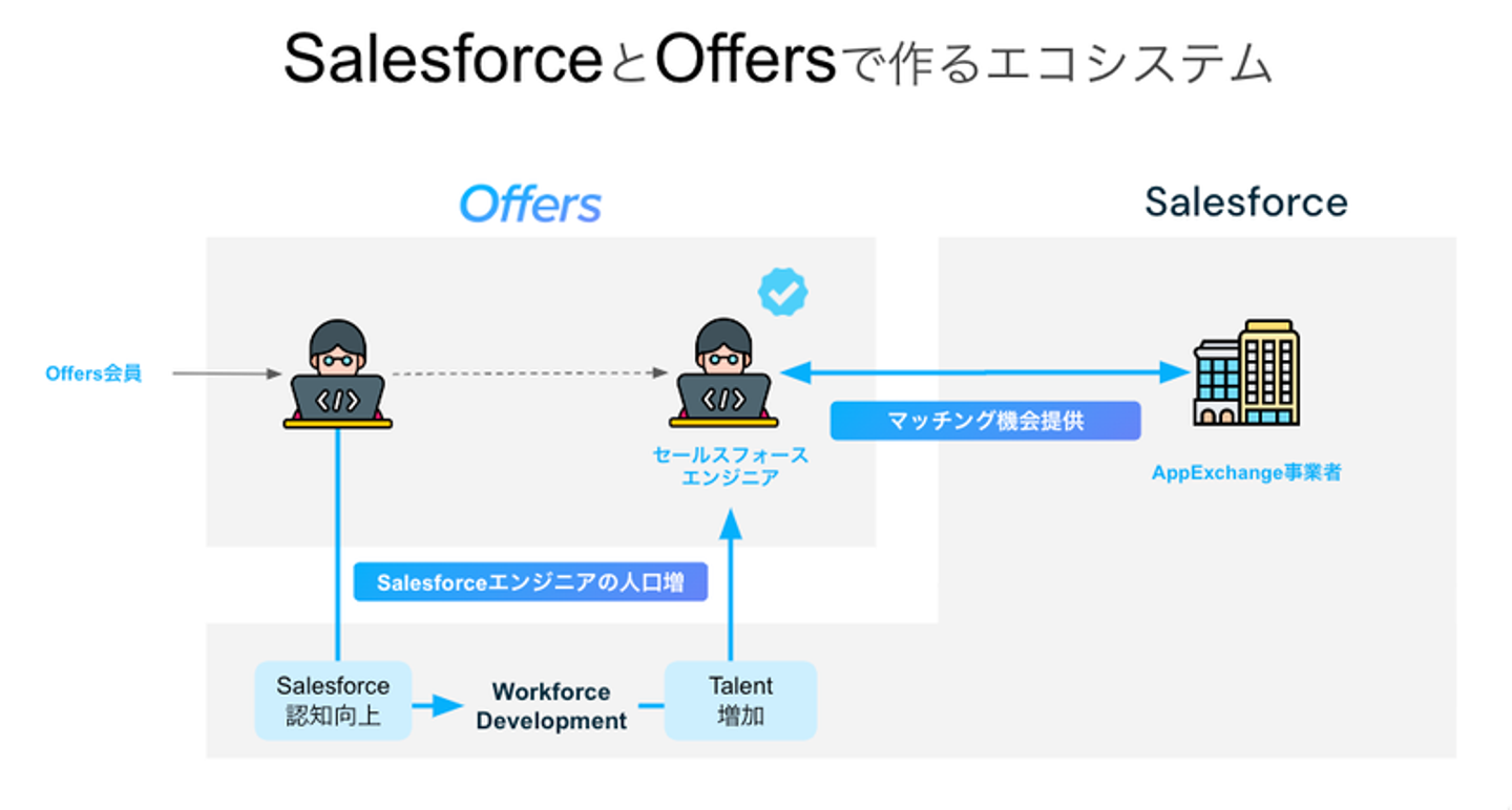 そこでSalesforceが持つトレーニングプログラムと「Offers」のプラットフォームを掛け合わせることで、Salesforceエンジニアの人口と活躍の場を増やすエコシステムを創ることを目指し、SalesforceとOffersは手を結ぶことになりました。