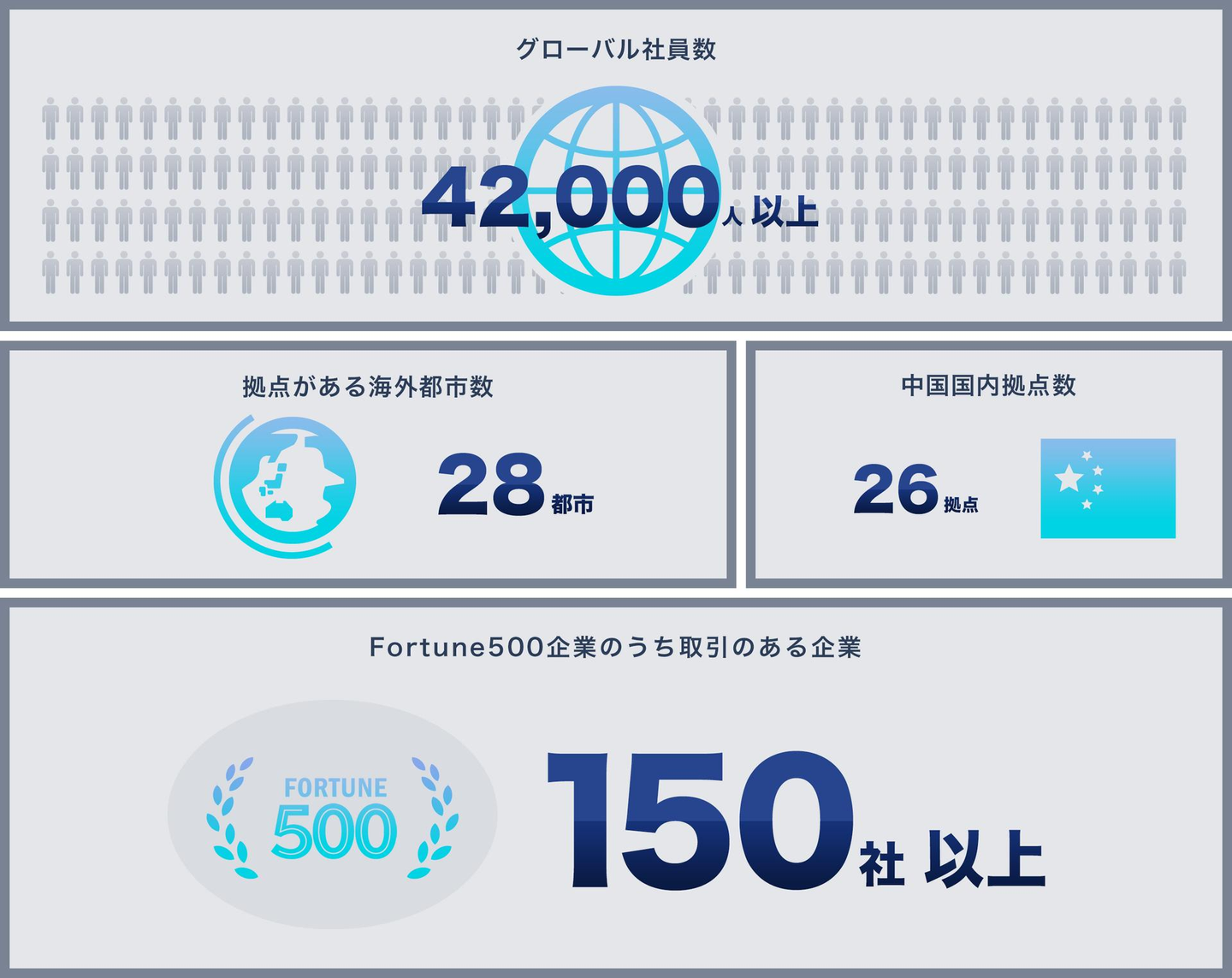 グローバルでは4万名を超える社員が在籍。Fortune500企業のうち150社以上と長期的な取引関係があり、安定的な事業基盤を持つとともに、近年の中国市場の急成長もあり大きく成長段階にある企業です。